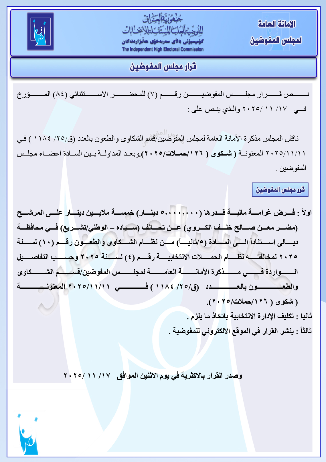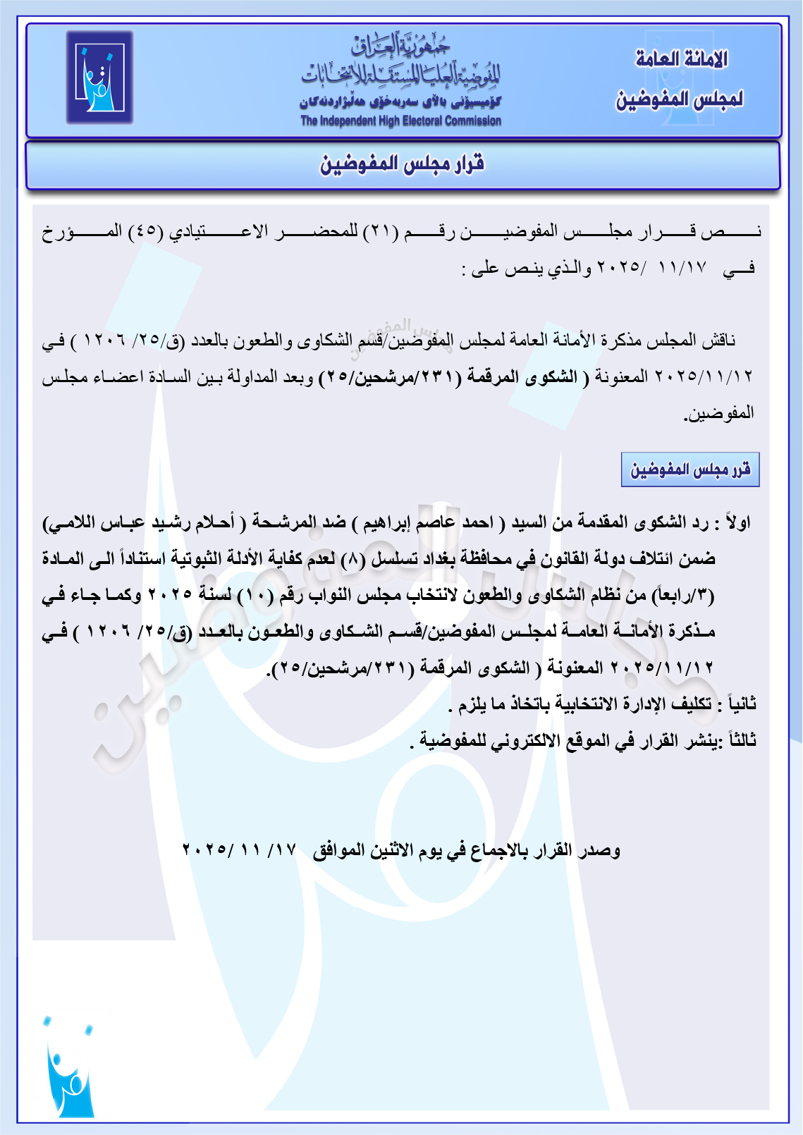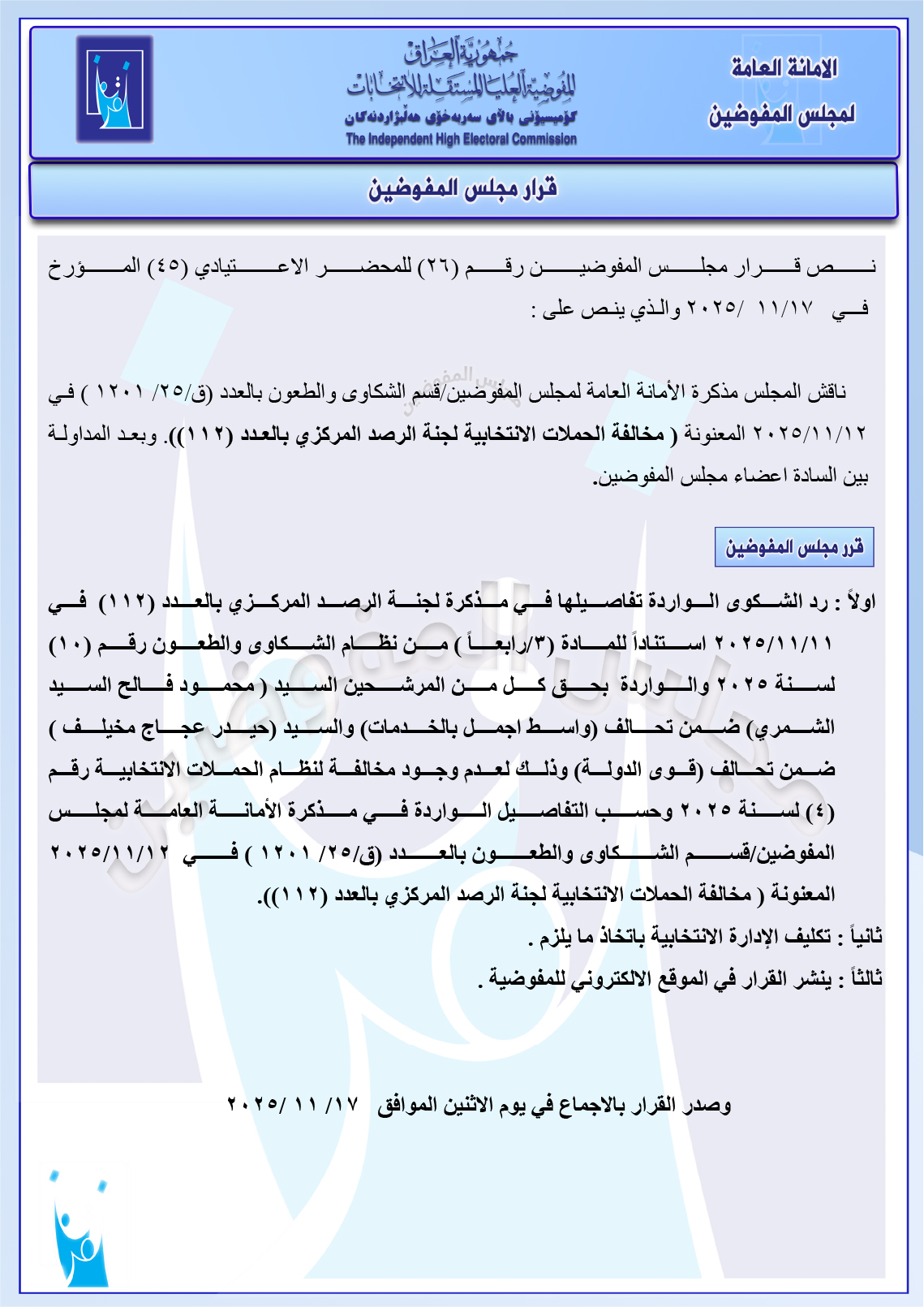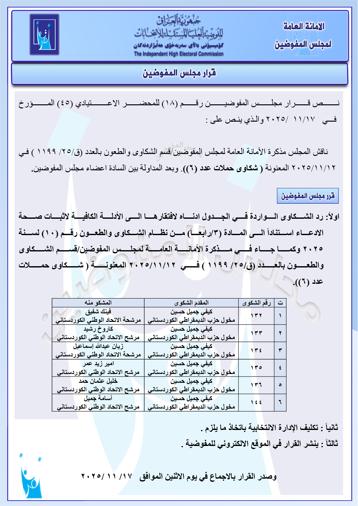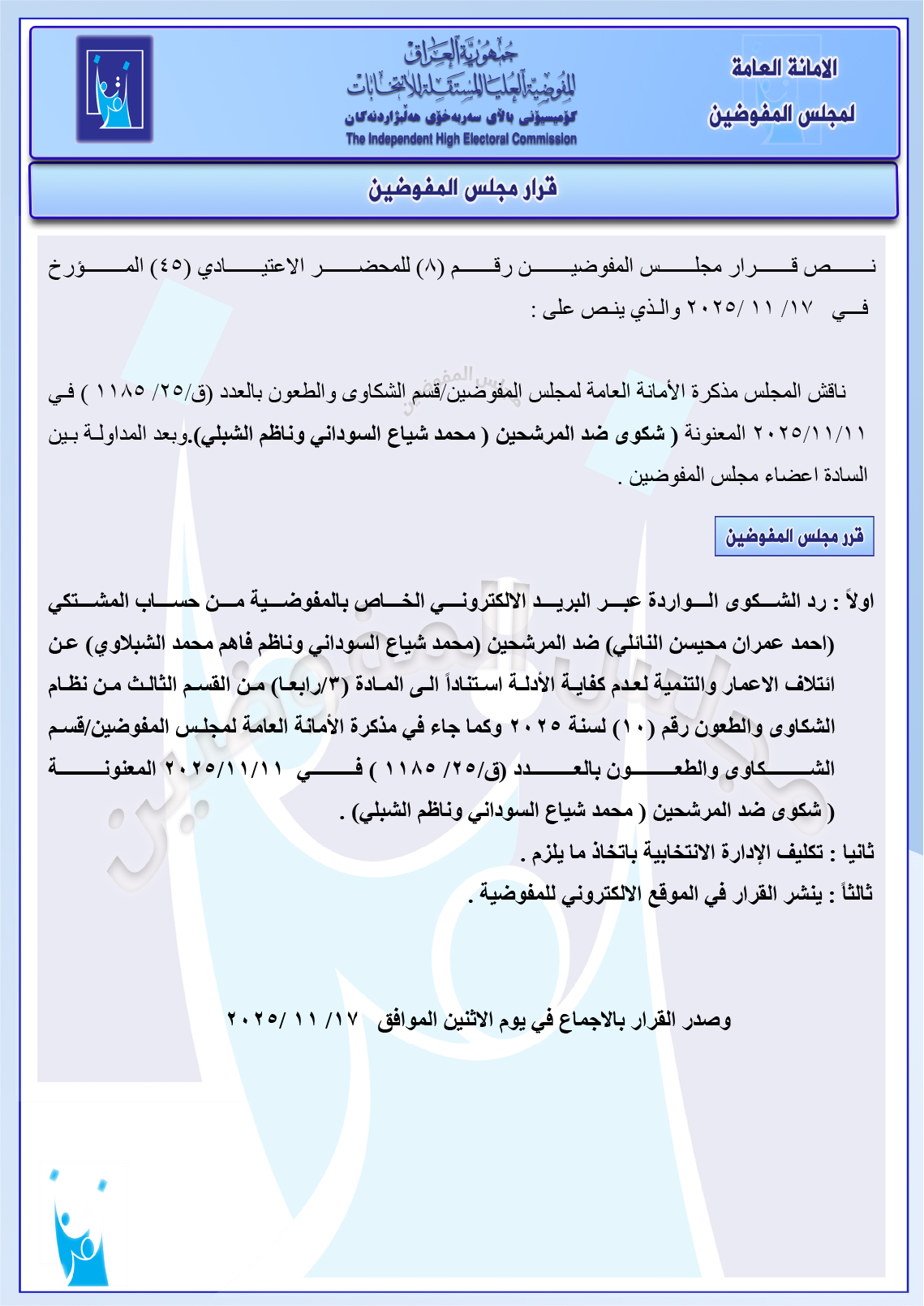 وثائق: مجلس المفوضين يرد شكوى مصطفى سند ضد ائتلاف السوداني ومجموعة شكاوى أخرى جميع قرارات الاجتماع الأخير