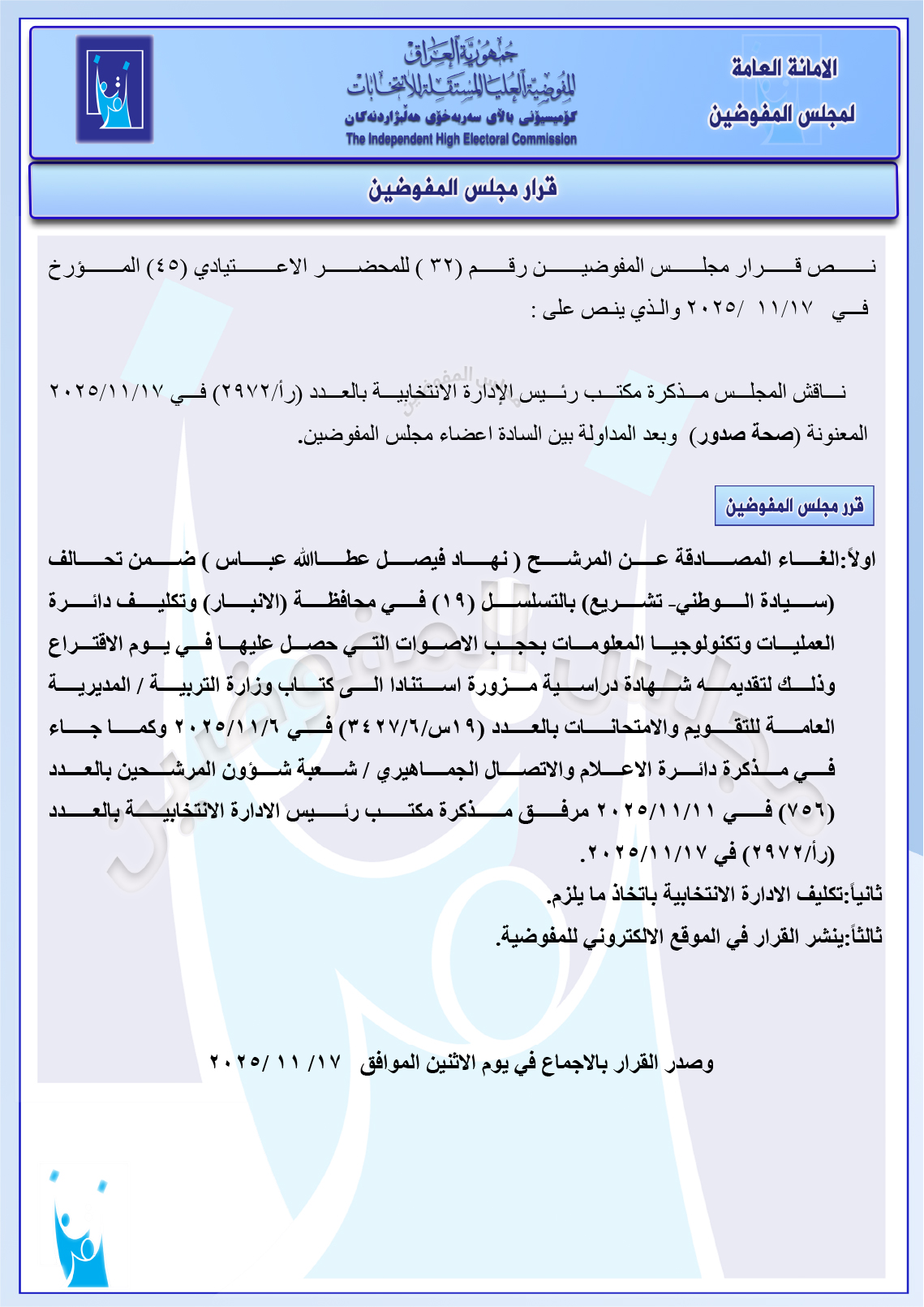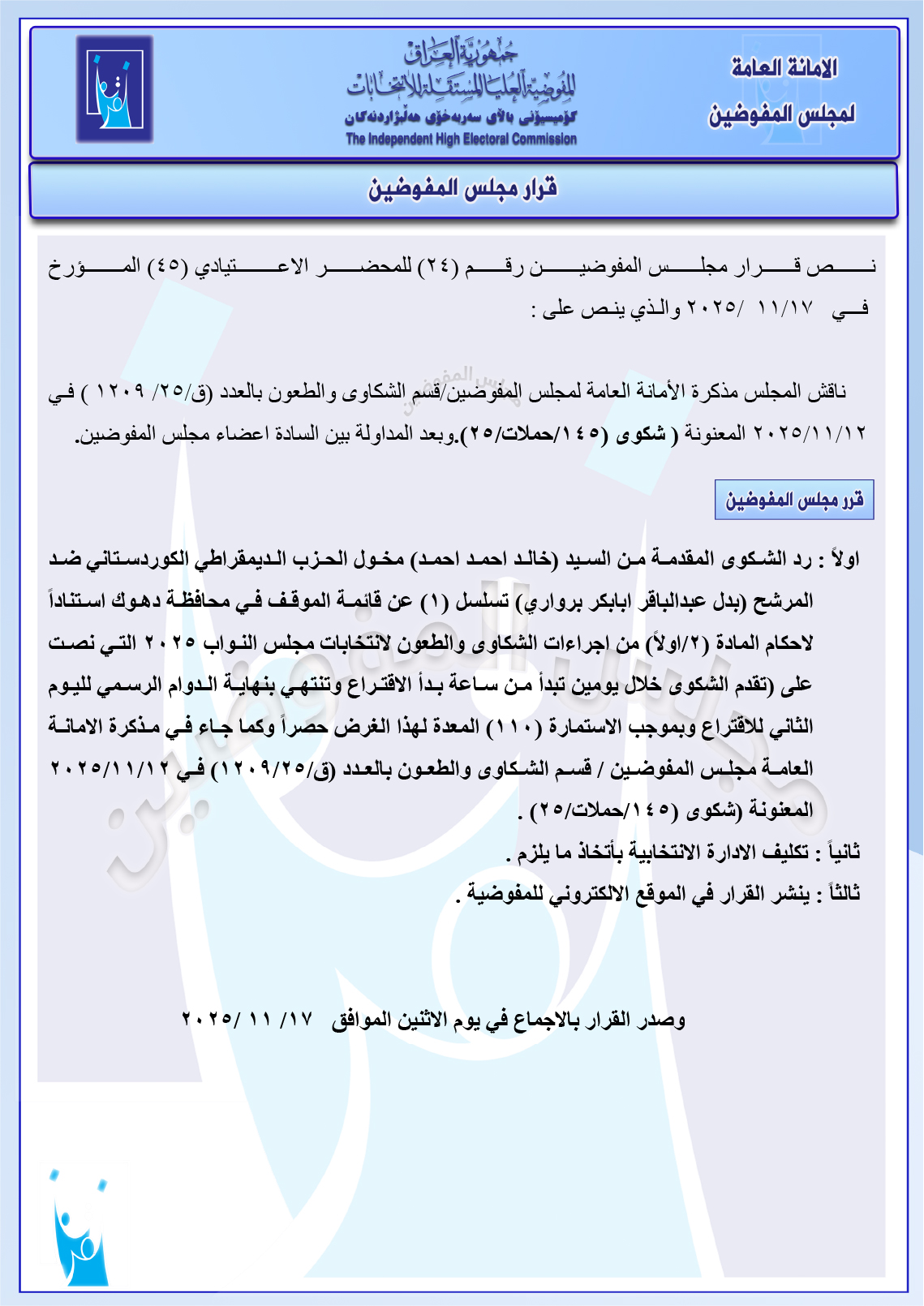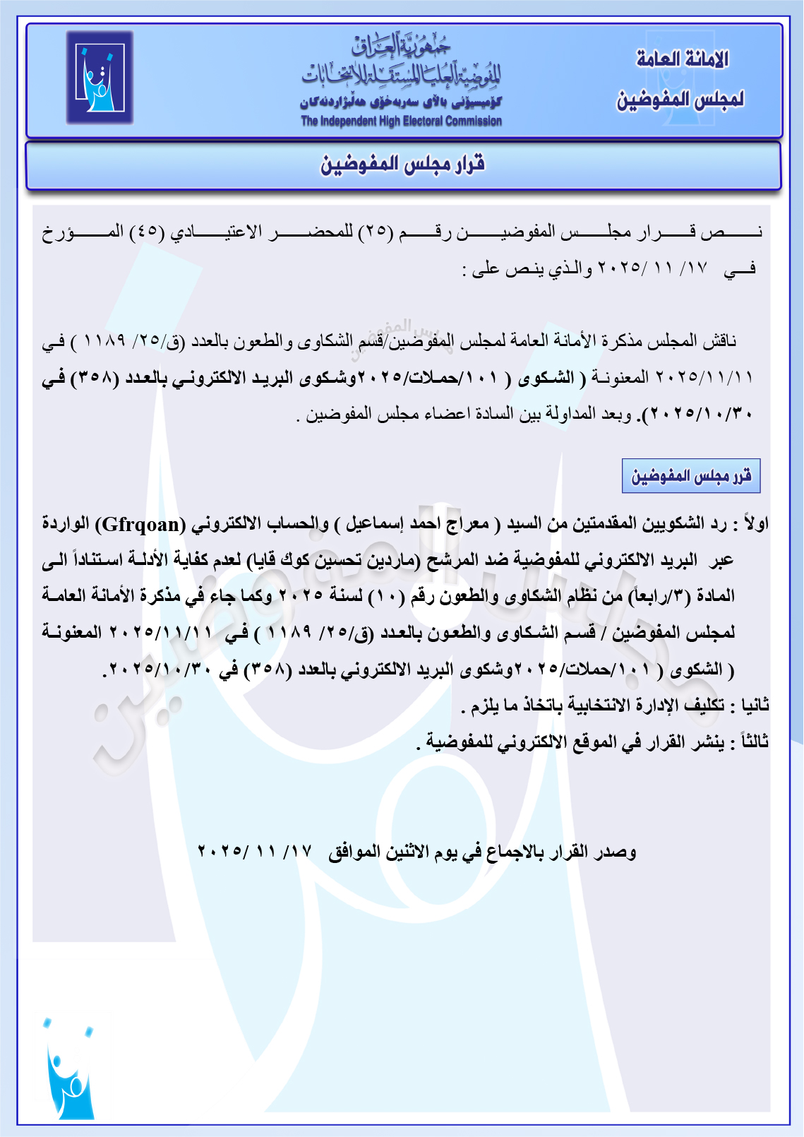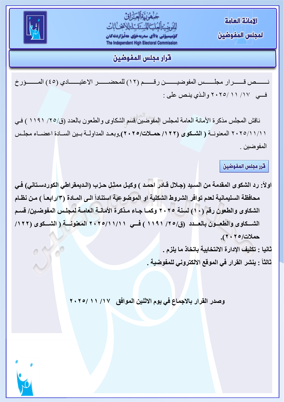 وثائق: مجلس المفوضين يرد شكوى مصطفى سند ضد ائتلاف السوداني ومجموعة شكاوى أخرى جميع قرارات الاجتماع الأخير