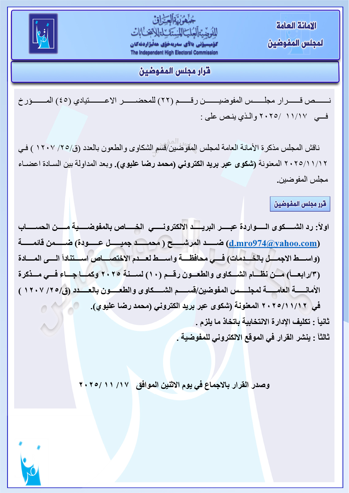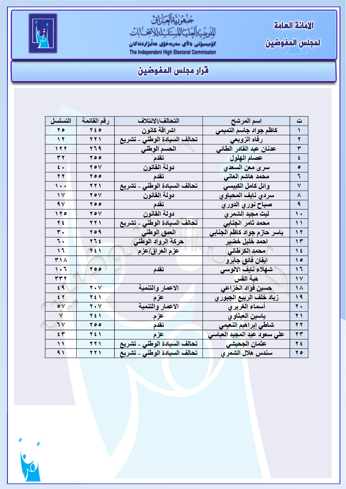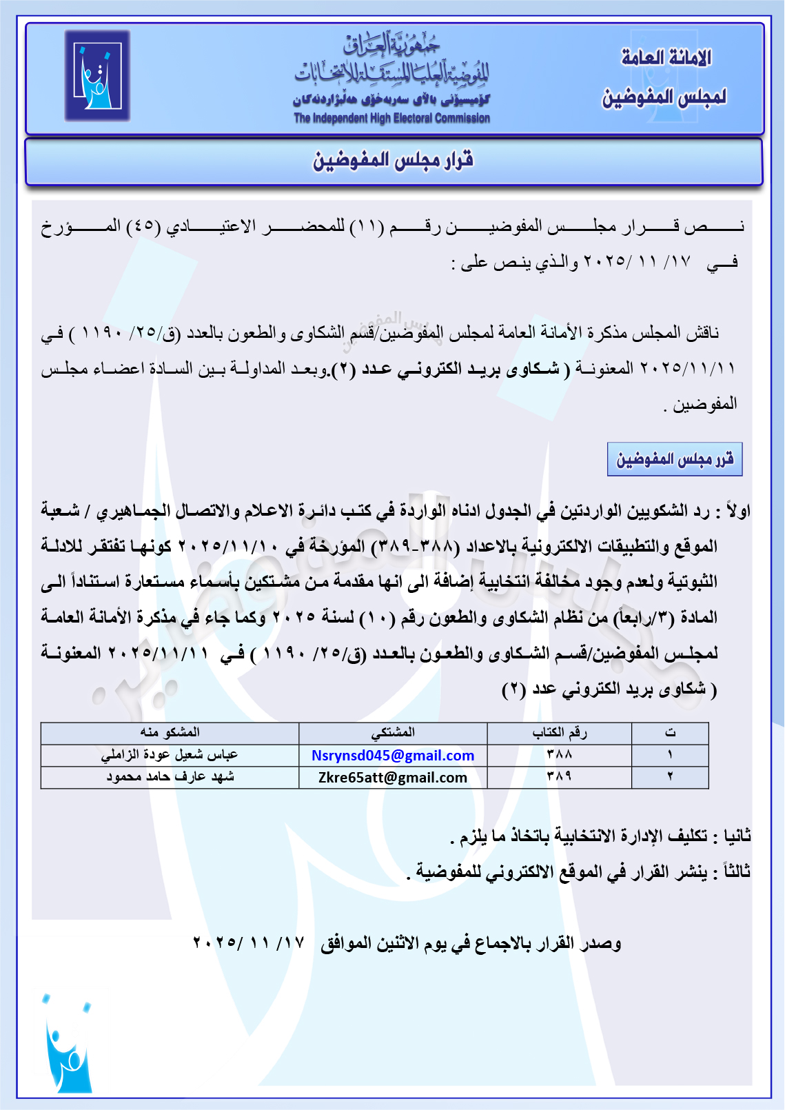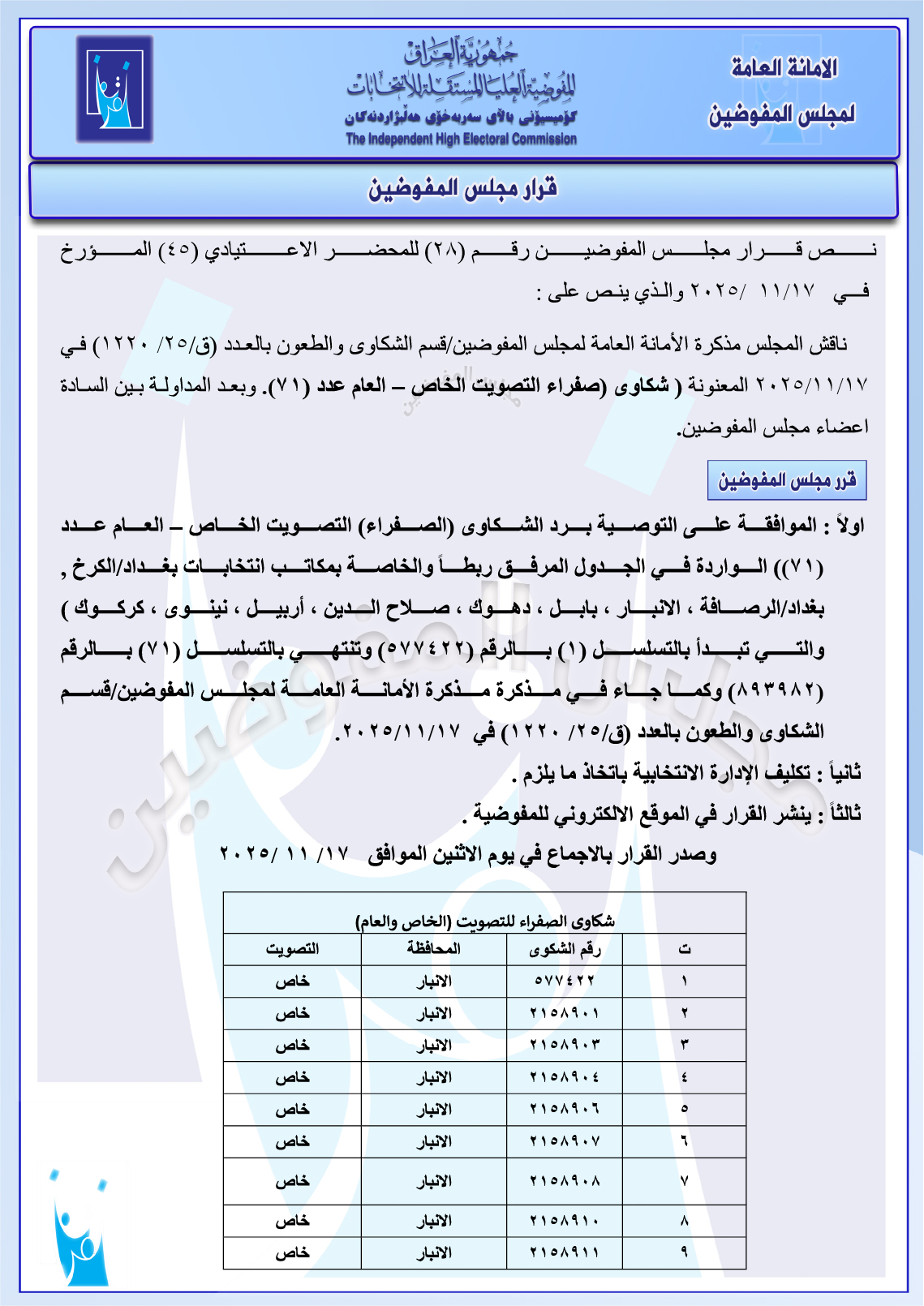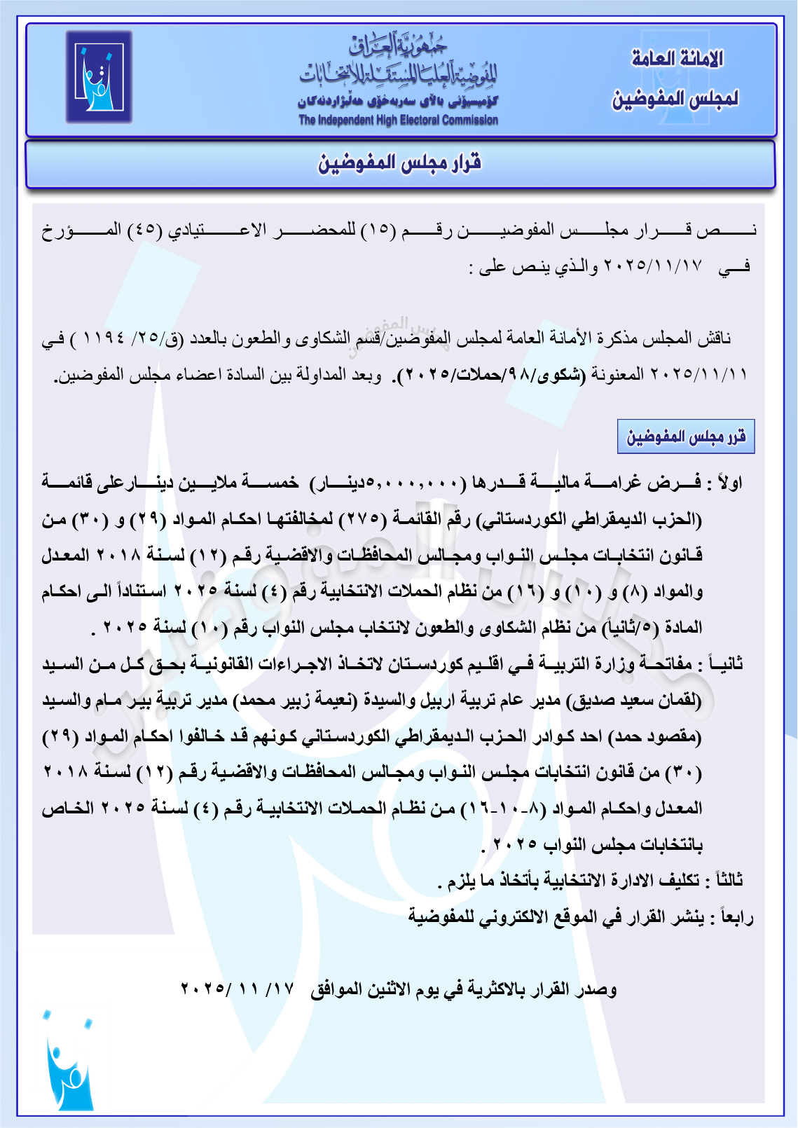 وثائق: مجلس المفوضين يرد شكوى مصطفى سند ضد ائتلاف السوداني ومجموعة شكاوى أخرى جميع قرارات الاجتماع الأخير
