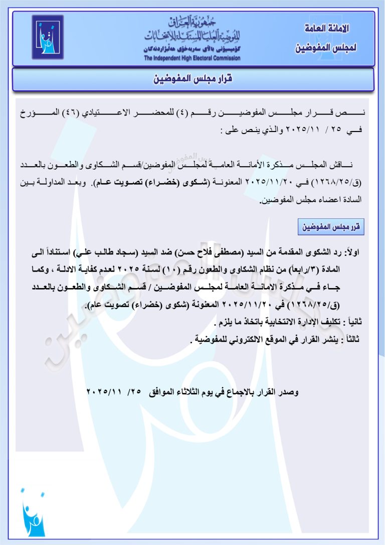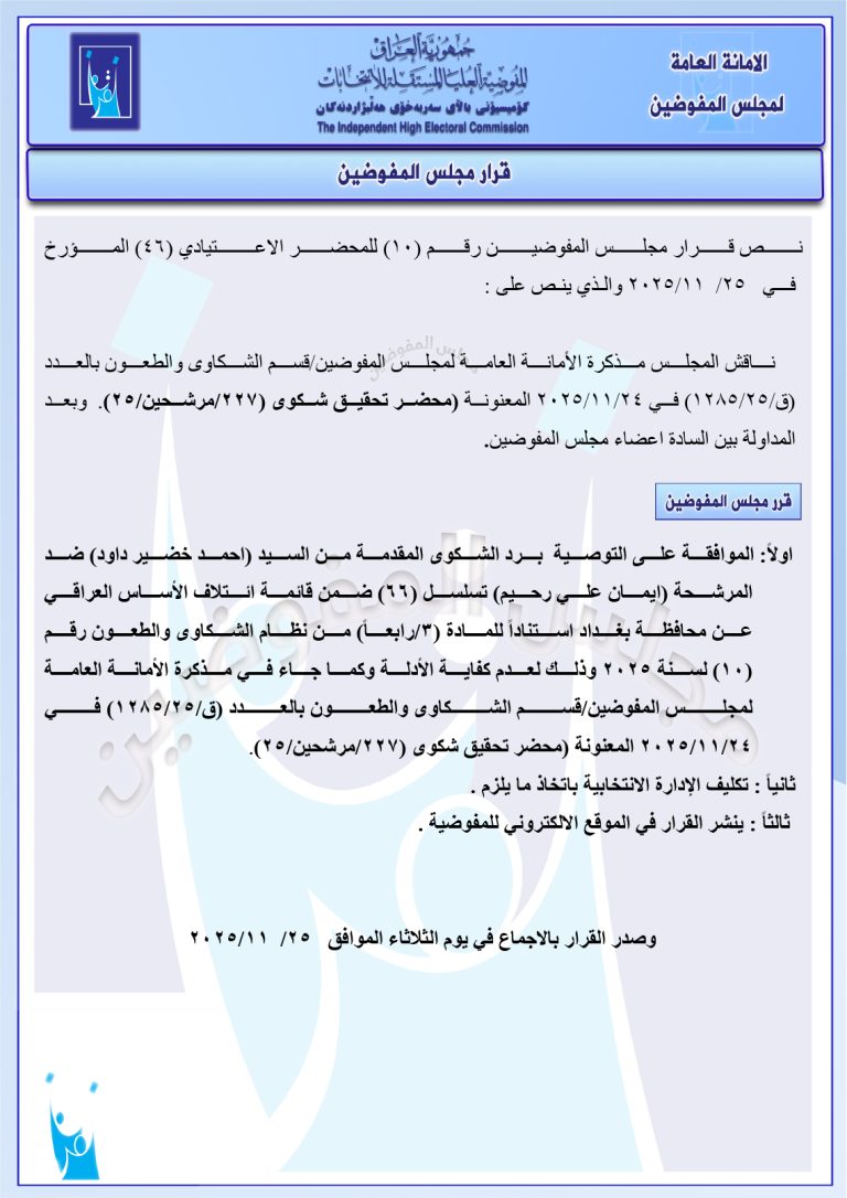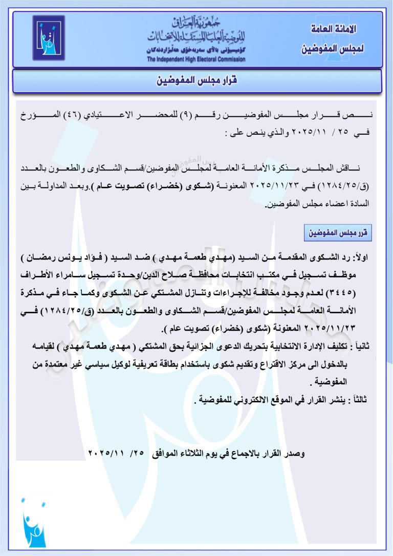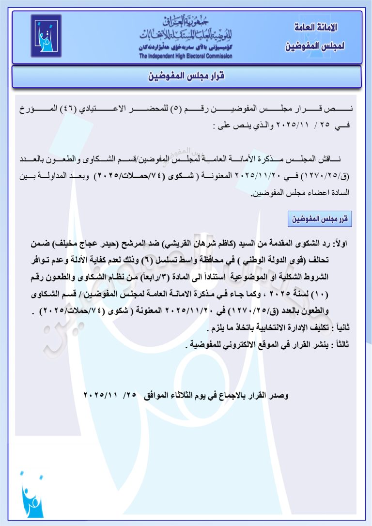 وثائق: رد شكوى خميس الخنجر ضد أحمد شهيد وشكوى عالية نصيف ضد عثمان الشيباني وغيرها قرارات جديدة لمجلس المفوضين Slide, أخبار انتخابية, كل الأخبار
