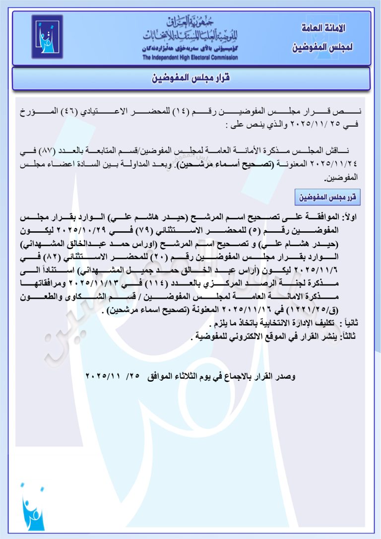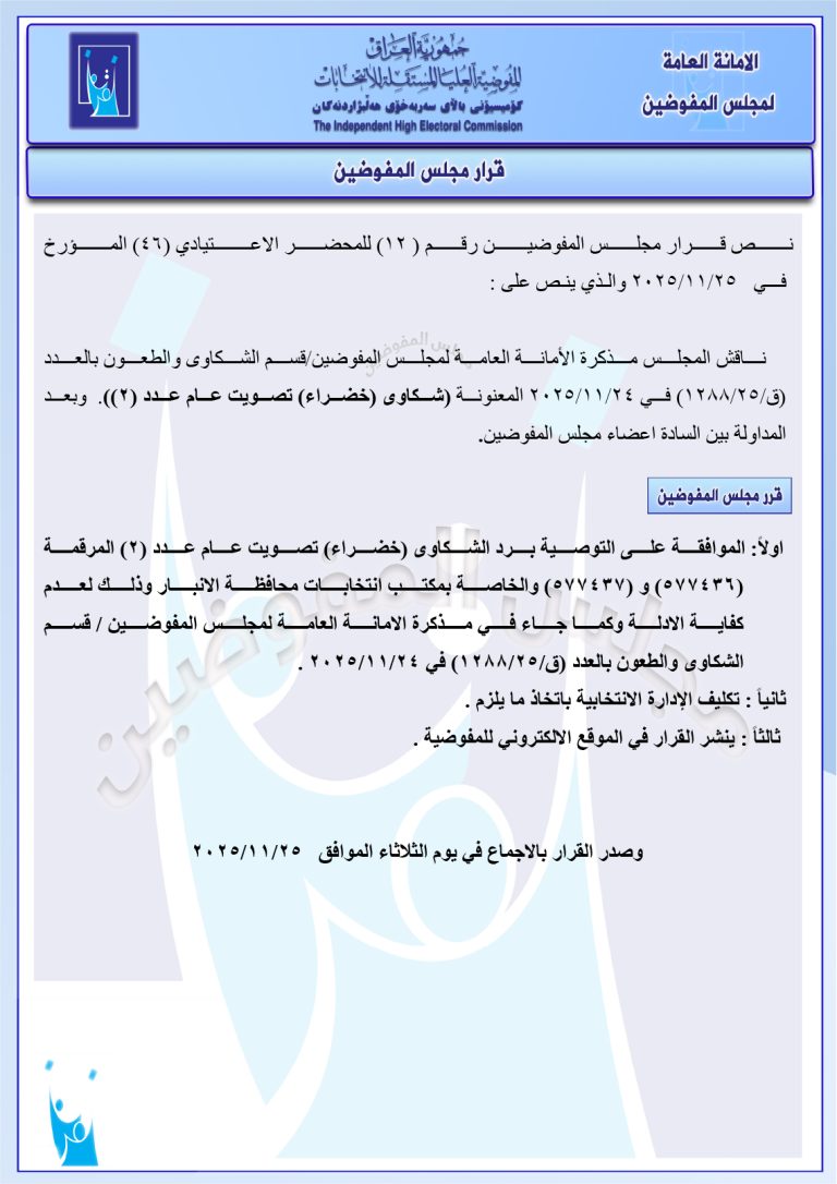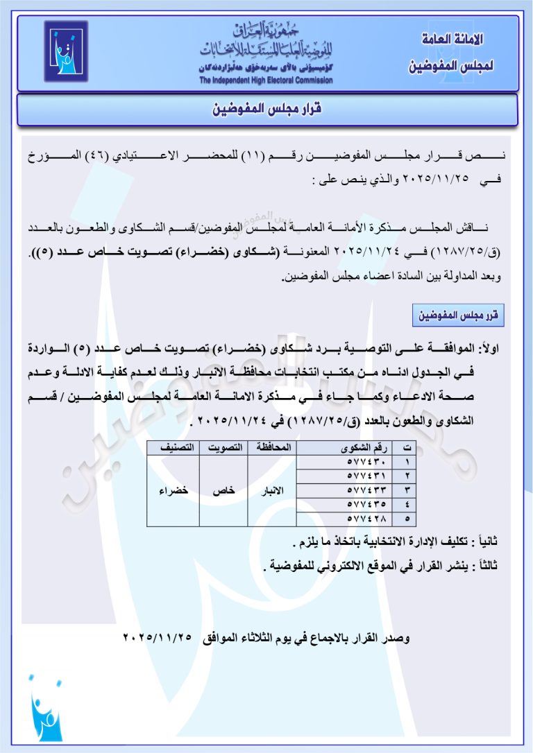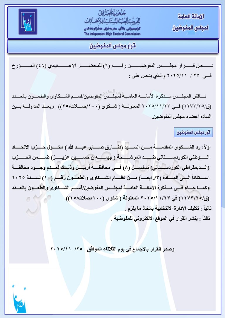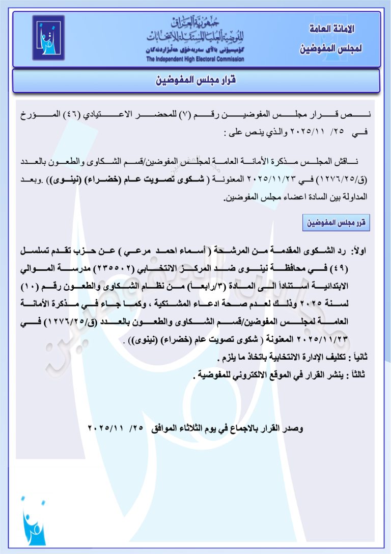 وثائق: رد شكوى خميس الخنجر ضد أحمد شهيد وشكوى عالية نصيف ضد عثمان الشيباني وغيرها قرارات جديدة لمجلس المفوضين Slide, أخبار انتخابية, كل الأخبار