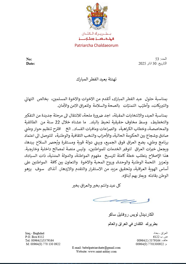 بدوره اقترح بطريرك الكلدان في العراق والعالم، الكاردينال لويس روفائيل ساكو، في رسالة تهنئة له بمناسبة عيد الفطر وقرب الانتخابات المقبلة، تنظيم الحوار الوطني، للتوصل إلى اعتماد برنامج وطني يضع العراق فوق الجميع، وفقاً لما جاء في رسالة التهنئة.