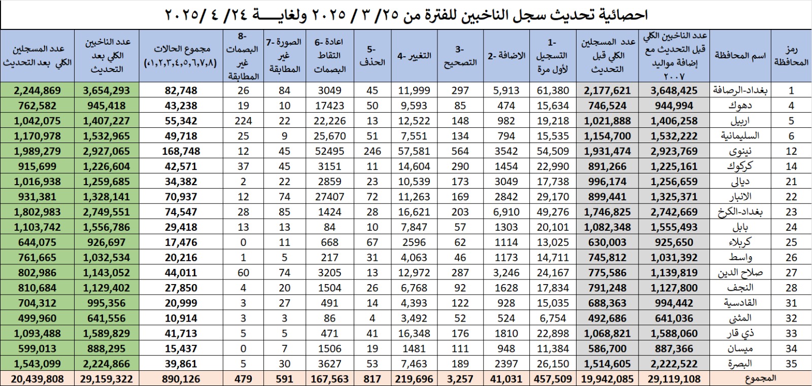 نشرت المفوضية العليا المستقلة للانتخابات، اليوم الخميس، آخر إحصائية لتحديث سجل الناخبين للفترة من 25/3 وحتى 24/4، حيث أظهرت الإحصائية وصول عدد الناخبين المسجلين لأكثر من 20 مليوناً من أصل 29 مليون ناخب يحق لهم التصويت.