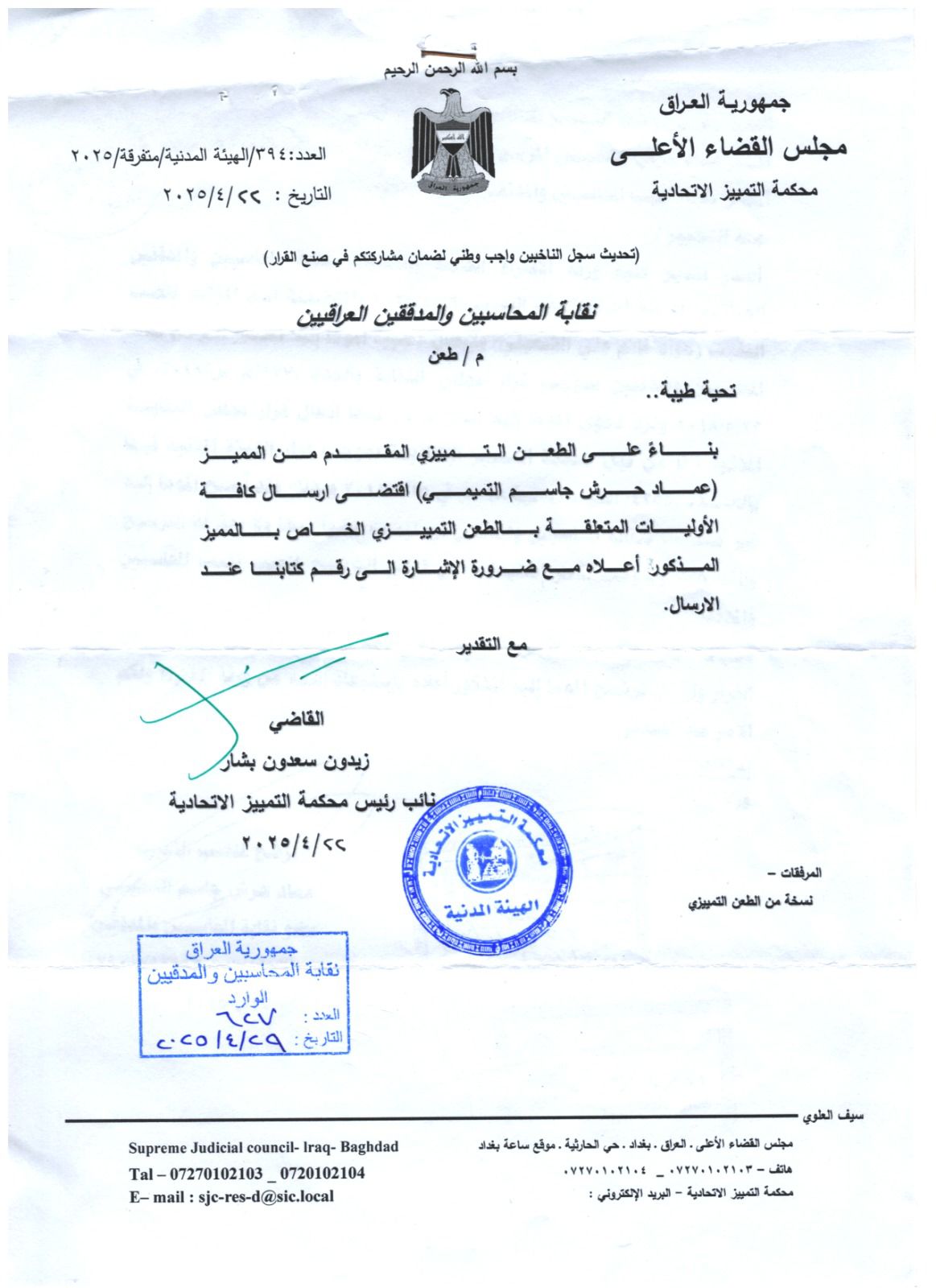 قضى نائب رئيس محكمة التمييز الاتحادية زيدون سعدون بشار، بإرسال أوليات الطعن التمييزي المقدم من المرشح لمنصب نقيب المحاسبين والمدققين عماد التميمي في الانتخابات التي أُجريت يوم السبت الموافق 26 نيسان الماضي، كخطوة أولى للنظر في الطعن المقدم من التميمي.