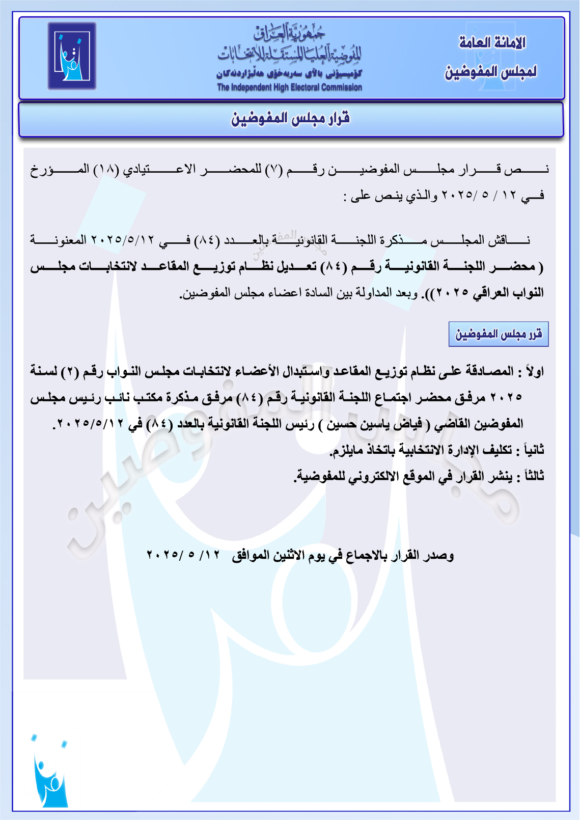 قرار مجلس المفوضيـن رقم (7) للمحضر الاعتيادي (18) المـؤرخ فـــي 2025/5/12