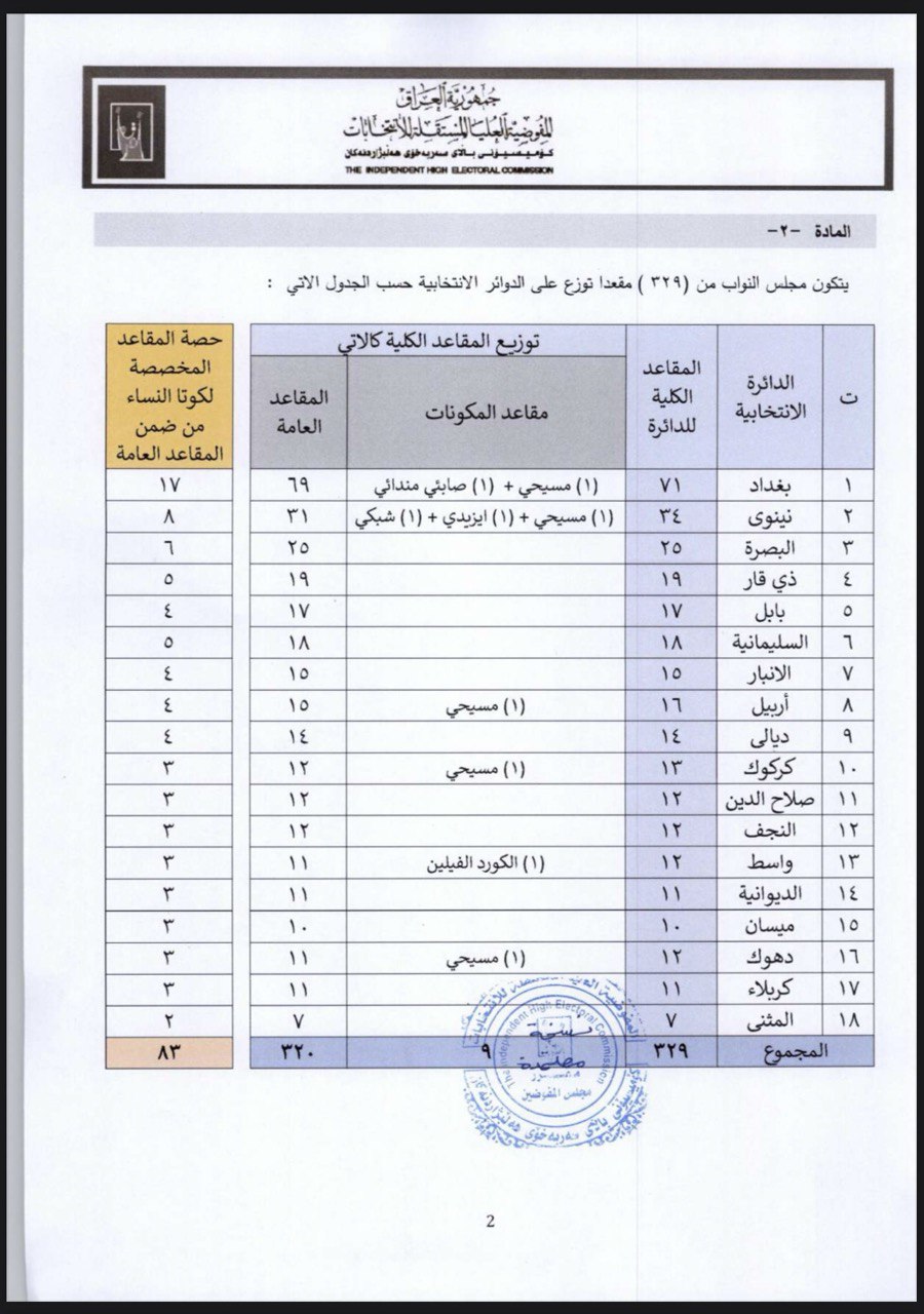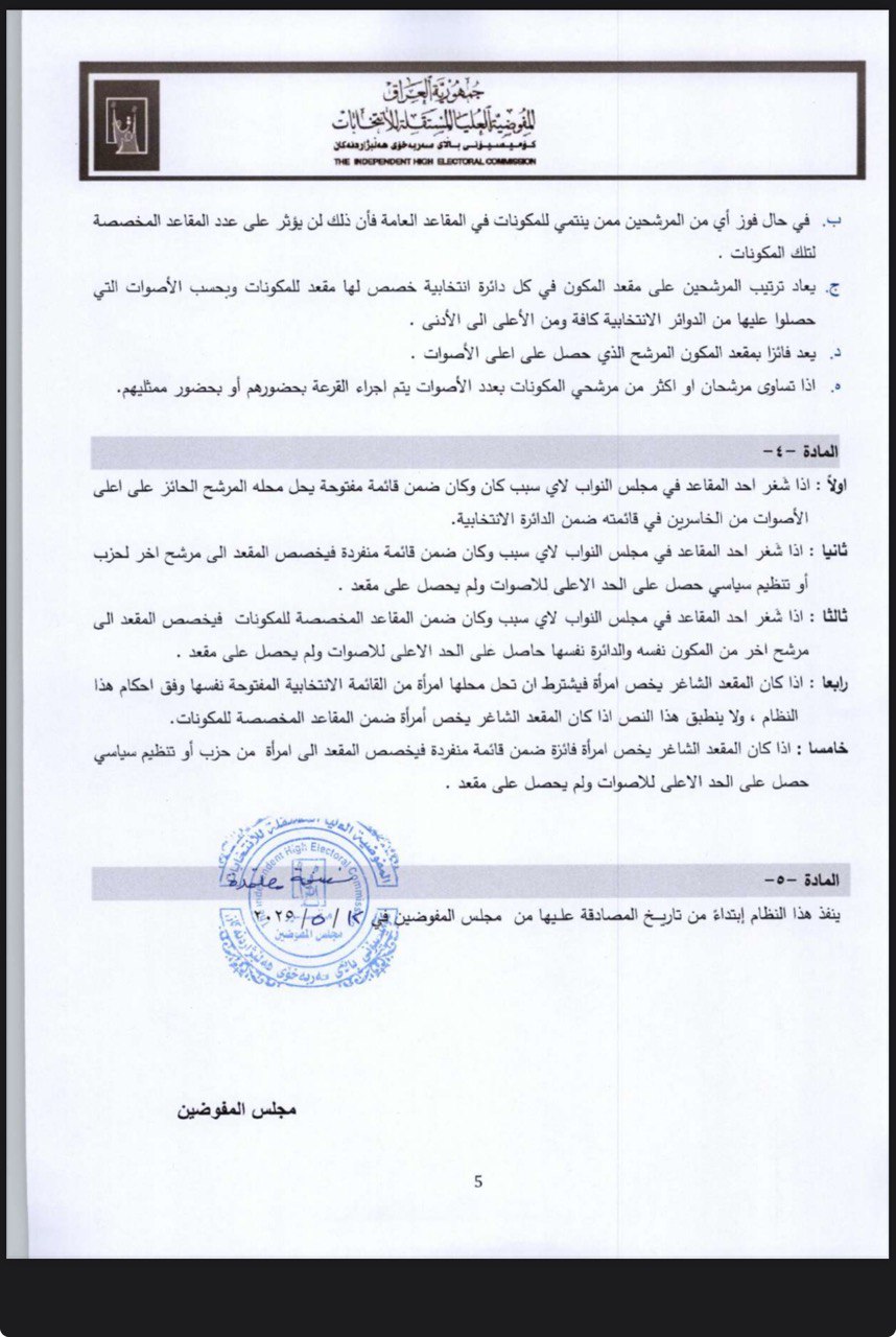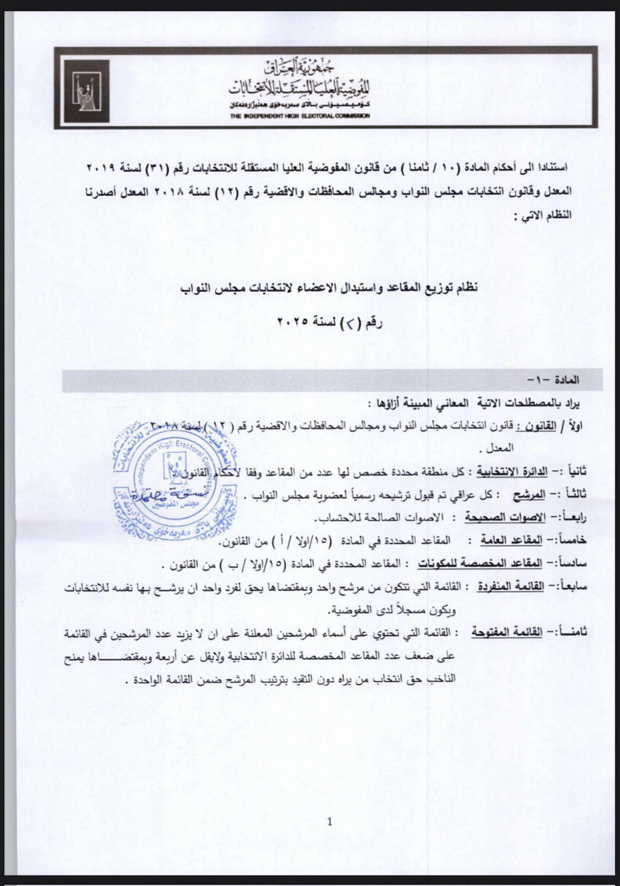 نظام توزيع المقاعد واستبدال الاعضاء لانتخابات مجلس النواب رقم (2) لسنة 2025