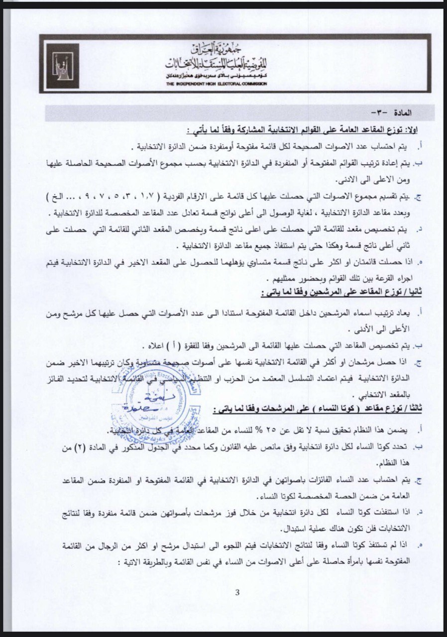أعلنت المفوضية العليا المستقلة للانتخابات، اليوم الثلاثاء، مصادقة مجلس المفوضين في جلسة أمس الاثنين، على قرارين يتعلق أحدهما بنظام توزيع المقاعد واستبدال الأعضاء للانتخابات النيابية المقبلة، والآخر بتمديد “نهائي” لفترة تسجيل التحالفات والأحزاب السياسية.