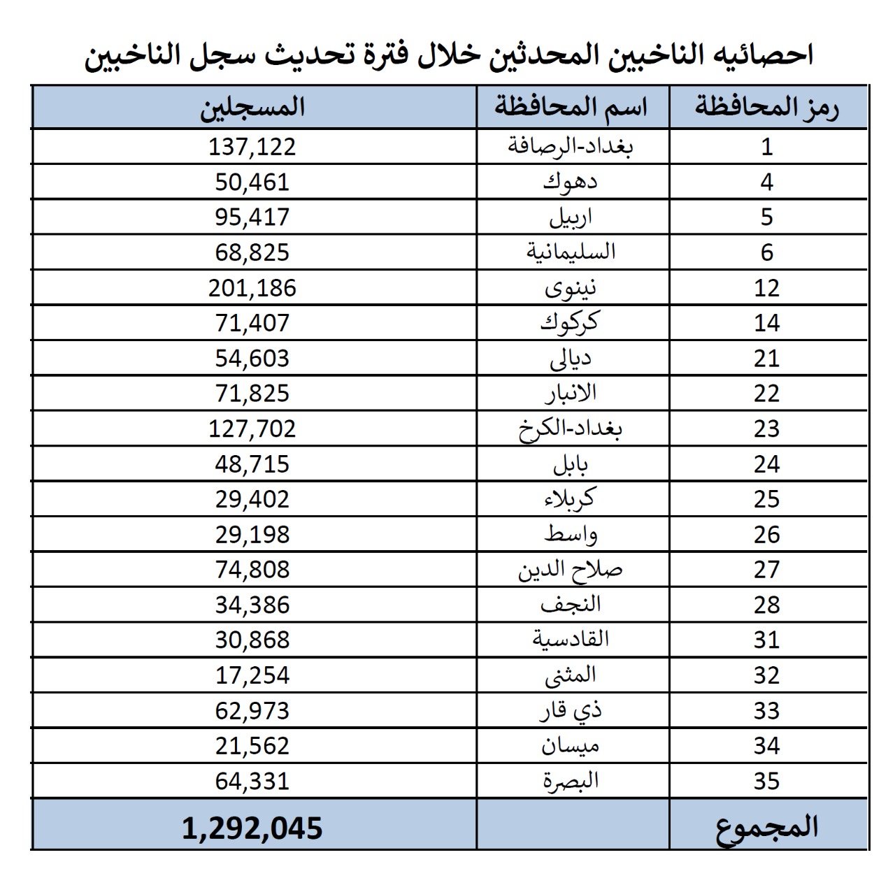 ووفقاً لجدول بياني نشرته المفوضية، وتلقته شبكة أخبار الانتخابات العراقية، فإن عدد الناخبين المحدّثين لبياناتهم في عموم العراق بلغ 1.292.045.