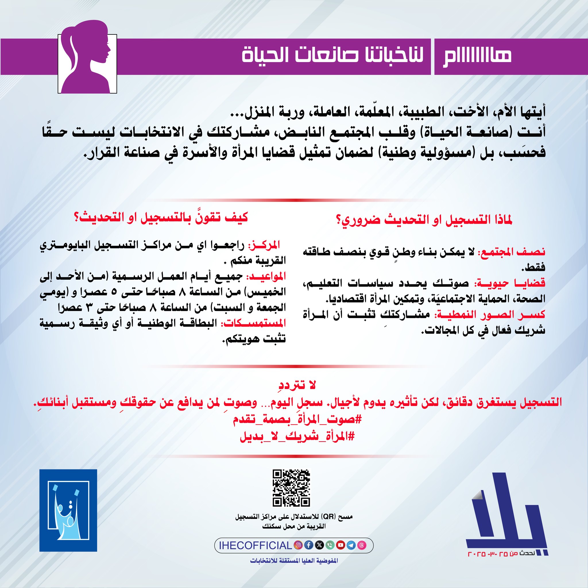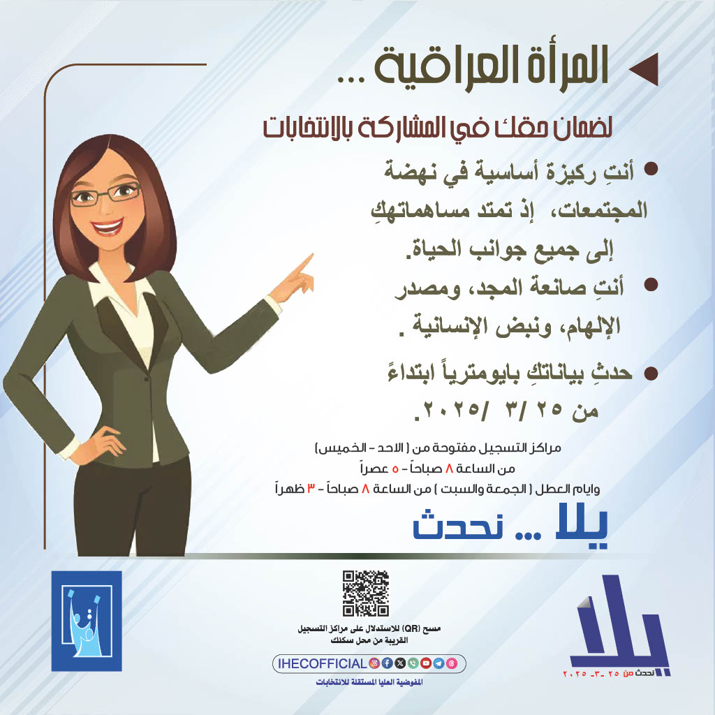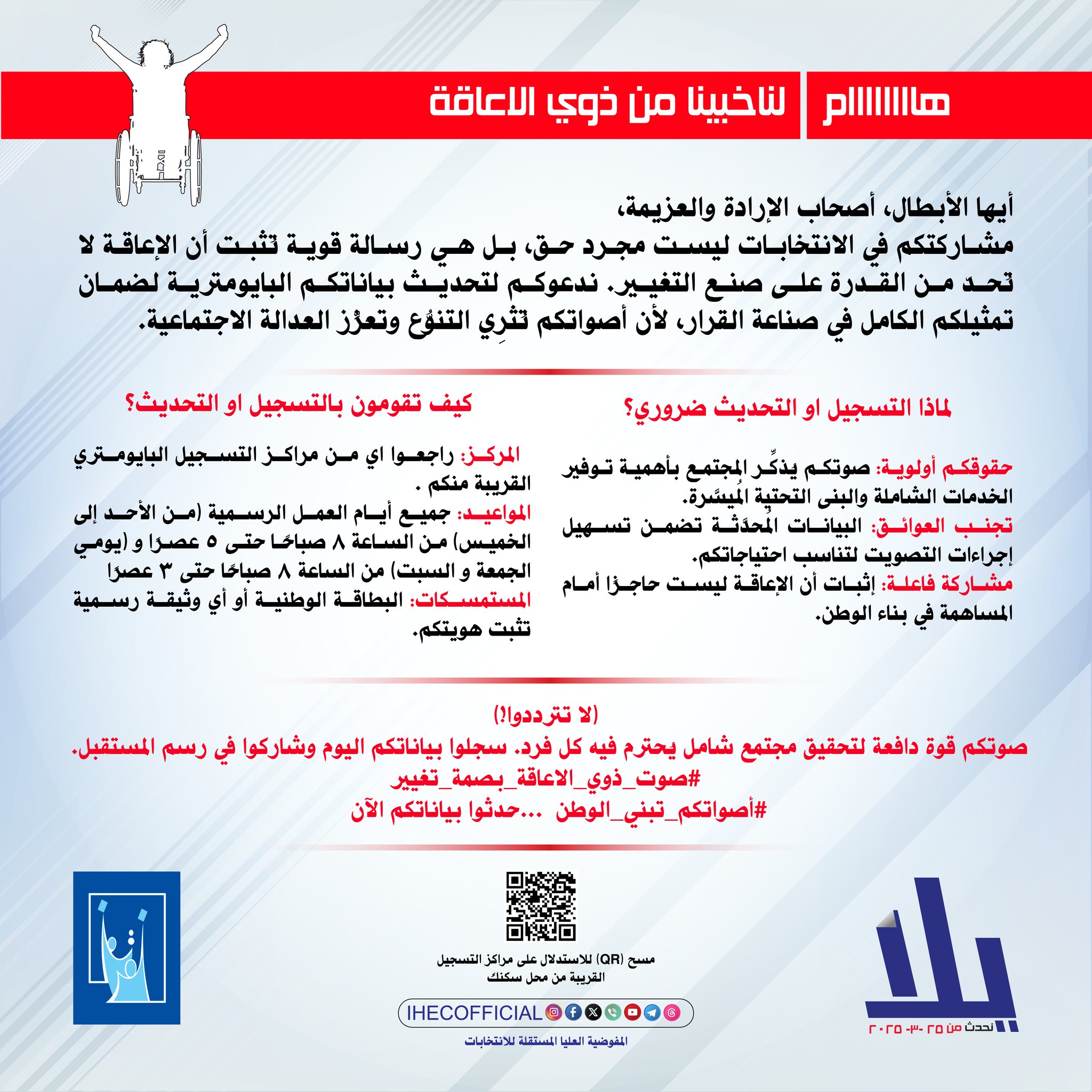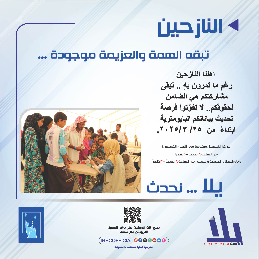 وجهت المفوضية العليا المستقلة للانتخابات، دعوتها إلى 4 شرائح في المجتمع لتحديث بياناتها الانتخابية خلال الأيام الخمسة الأخيرة المتبقية من فترة التحديث، وهي شريحة النساء، الطلبة، ذوو الهمم من ذوي الاحتياحات الخاصة فضلاً عن شريحة النازحين.