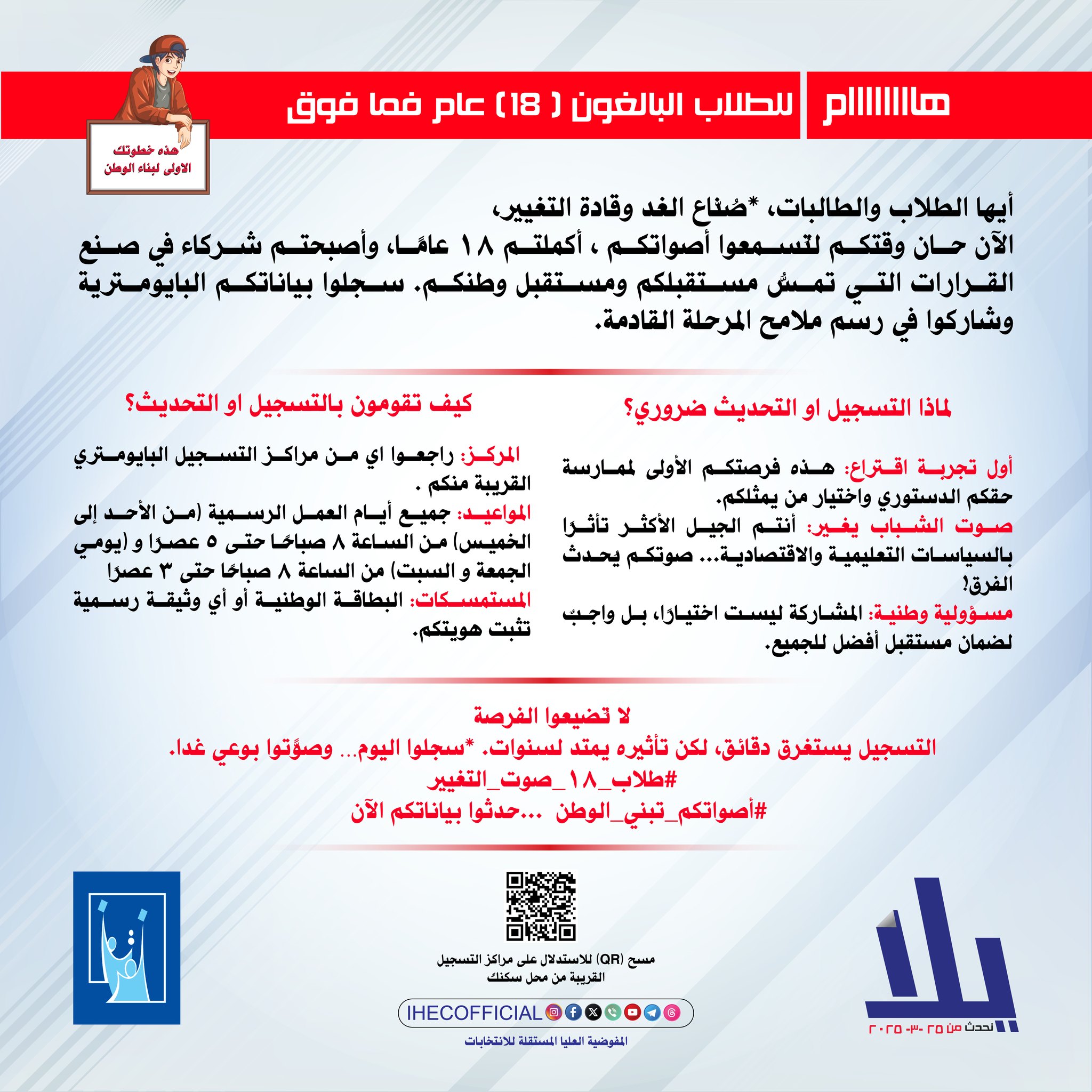 ونشرت المفوضية مجموعة إعلانات موجّهة للناخبين من هذه الشرائح ضمن حملة (يلا نحدّث)، مشيرة إلى أوقات وكيفية تحديث البيانات الانتخابية الخاصة بهم.