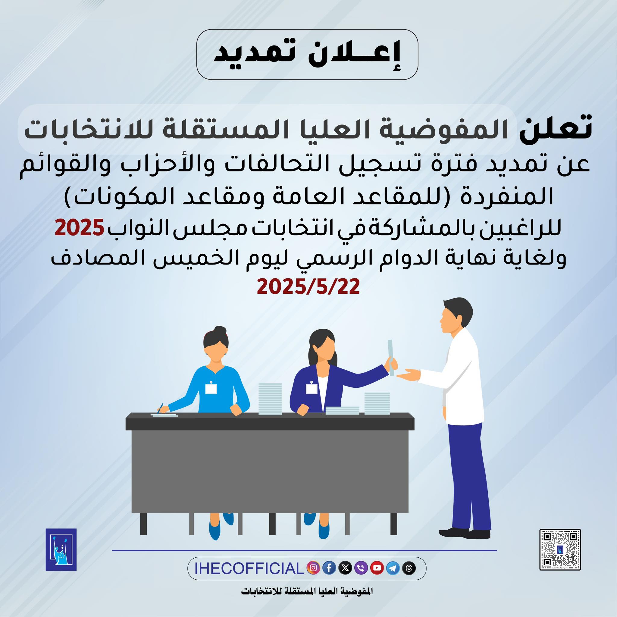 من جانبها نشرت دائرة شؤون الأحزاب والتنظيمات السياسية، إعلان تمديد جاء فيه، إن الدائرة “تُعلن عن قرار مجلس المفوضين المتضمن تمديد فترة تسجيل التحالفات السياسية لغاية نهاية الدوام الرسمي ليوم الخميس الموافق 22 أيار 2025”.