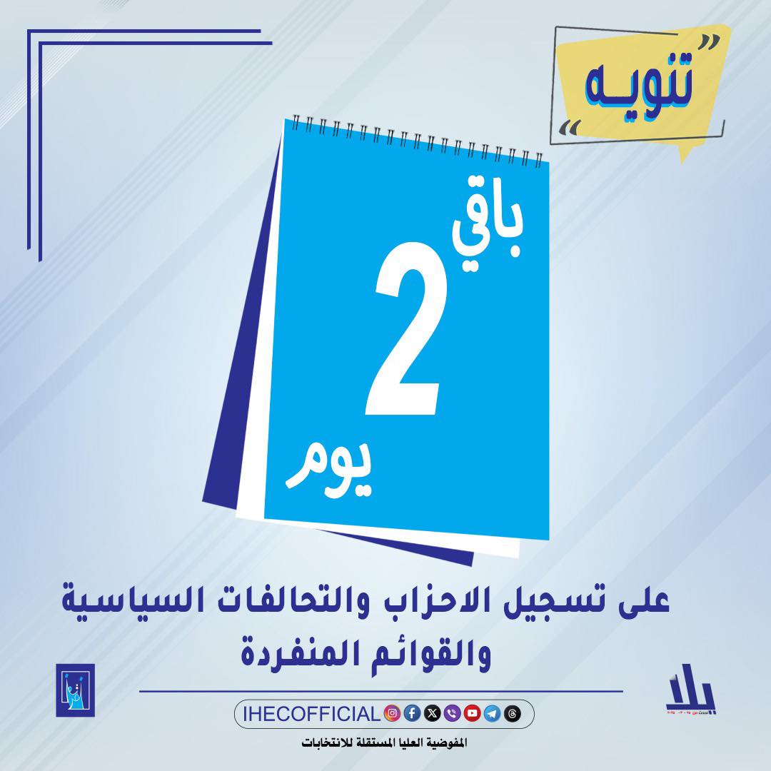 كما نوّهت المفوضية، إلى بقاء يومين فقط، على تسجيل الأحزاب والتحالفات السياسية والقوائم المنفردة.
