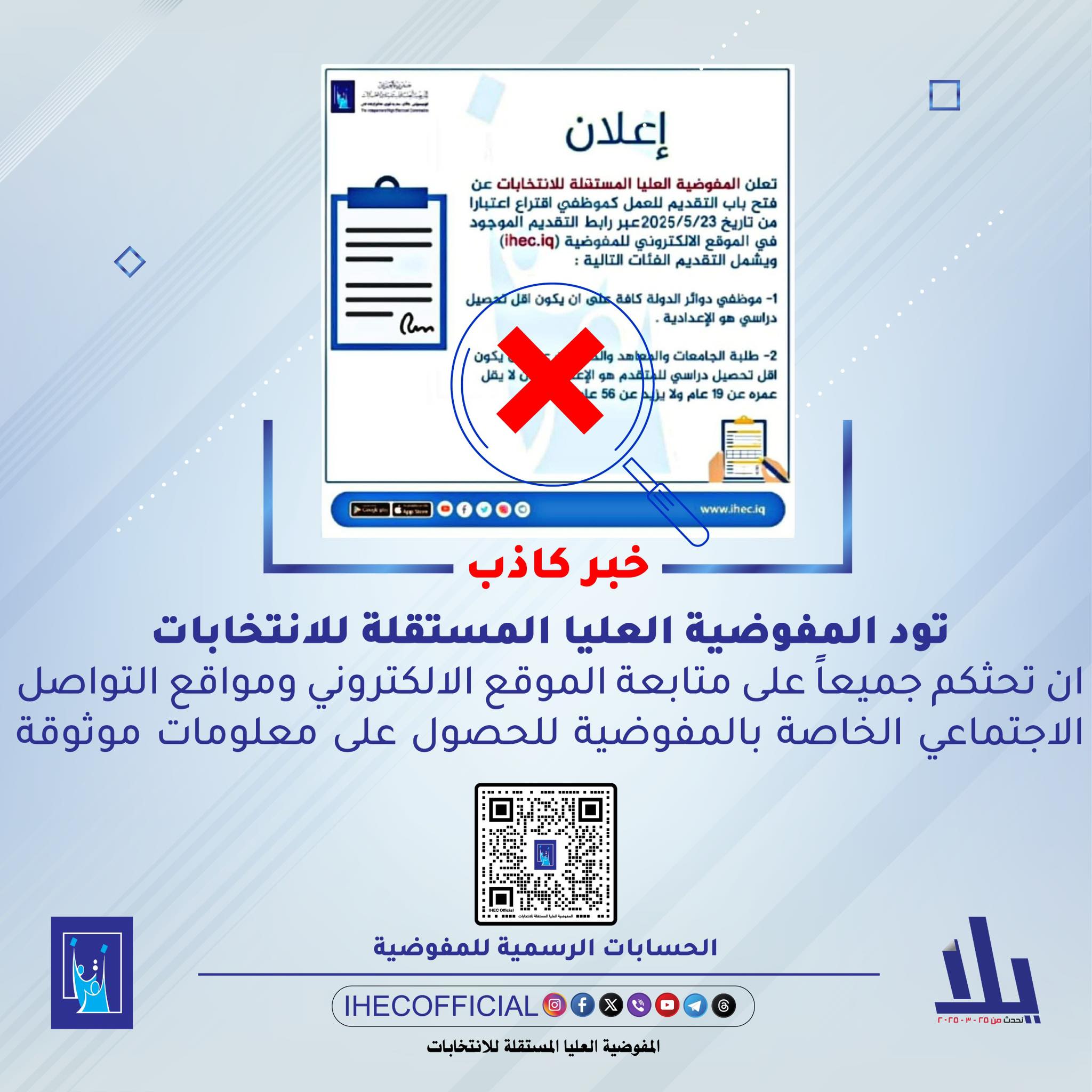 نفت المفوضية العليا المستقلة للانتخابات، اليوم الثلاثاء، صحة خبر يتحدث عن فتحها باب التقديم للعمل كموظفي اقتراع، مبينة أن الخبر المنشور هو خبر كاذب.