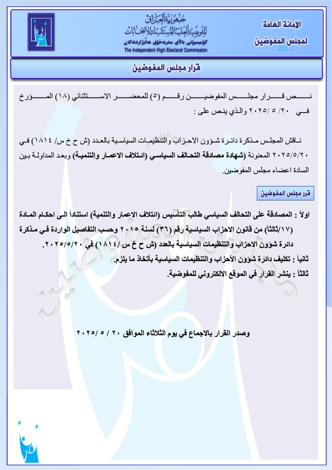 نشرت المفوضية العليا المستقلة للانتخابات، قرار مجلس المفوضين الخاص بالمصادقة على طلب تأسيس ائتلاف الإعمار والتنمية.