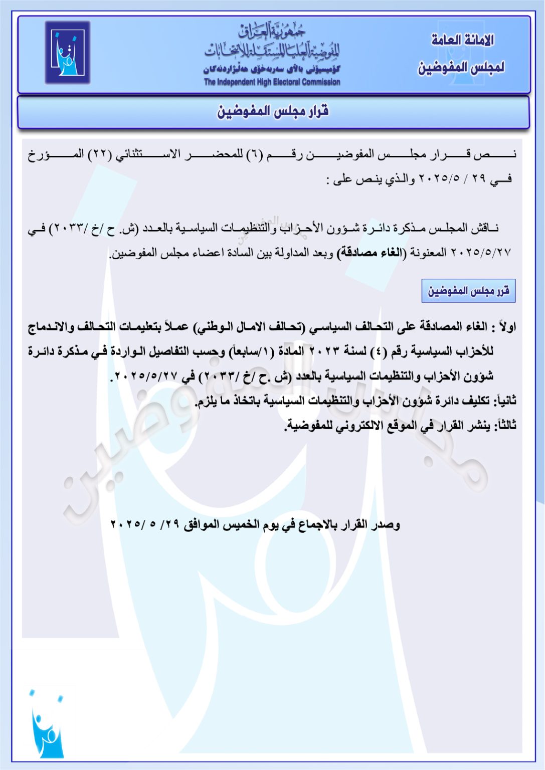 أعلنت المفوضية العليا المستقلة للانتخابات، اليوم الخميس، إلغاء مصادقة مجلس المفوضين على تحالف سياسي، ومصادقته على 4 تحالفات أخرى، مع رد تظلّم مقدّم في أحد قرارات الهيأة القضائية في المفوضية.