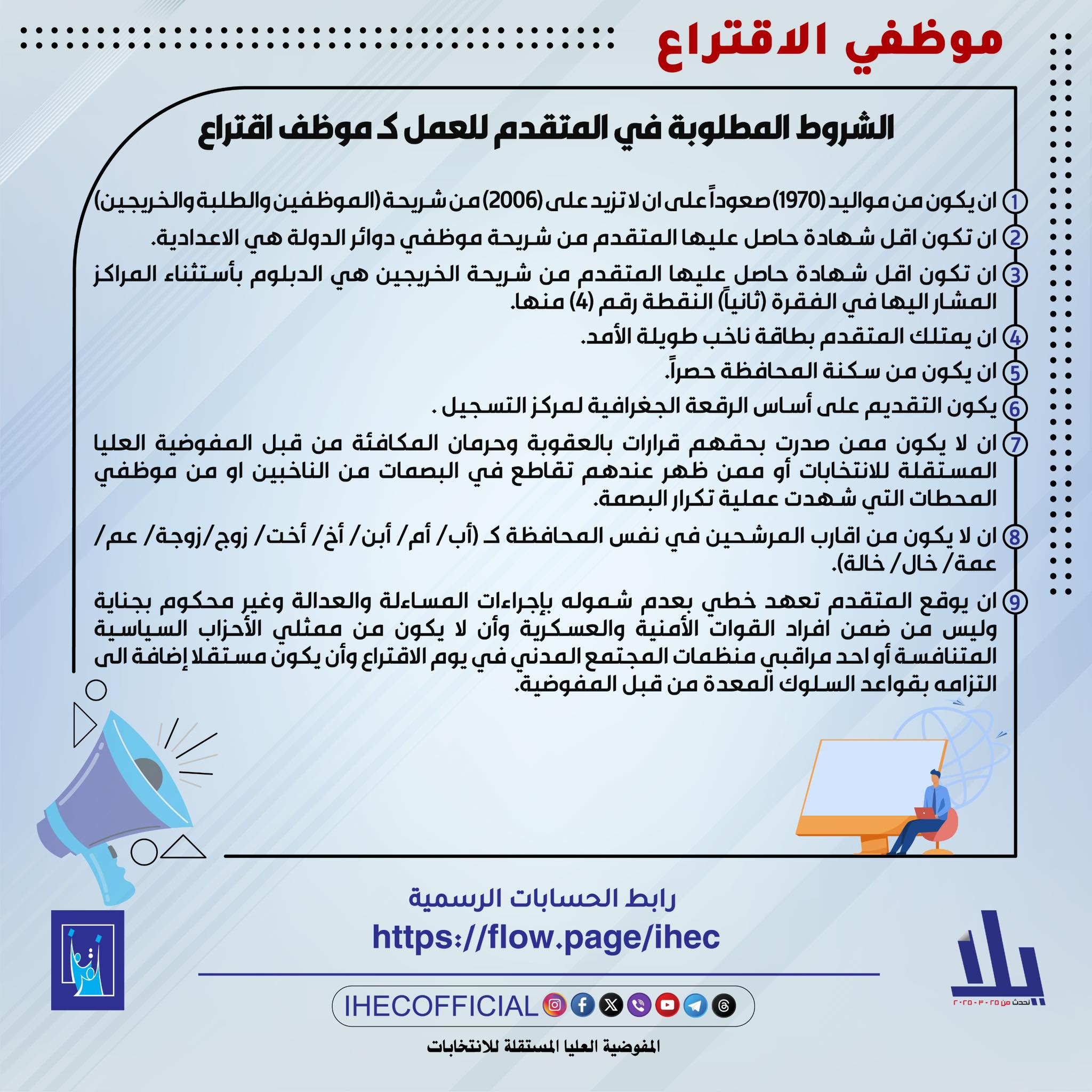وحددت المفوضية الشروط المطلوبة للموافقة على طلبات المتقدمين للعمل كموظفي اقتراع، حيث لن تتم الموافقة على الأشخاص الذين لا تتوافر فيهم الشروط المطلوبة من حيث العمر والشهادة الدراسية والموقع الجغرافي وغيرها من شروط موضحة أدناه.