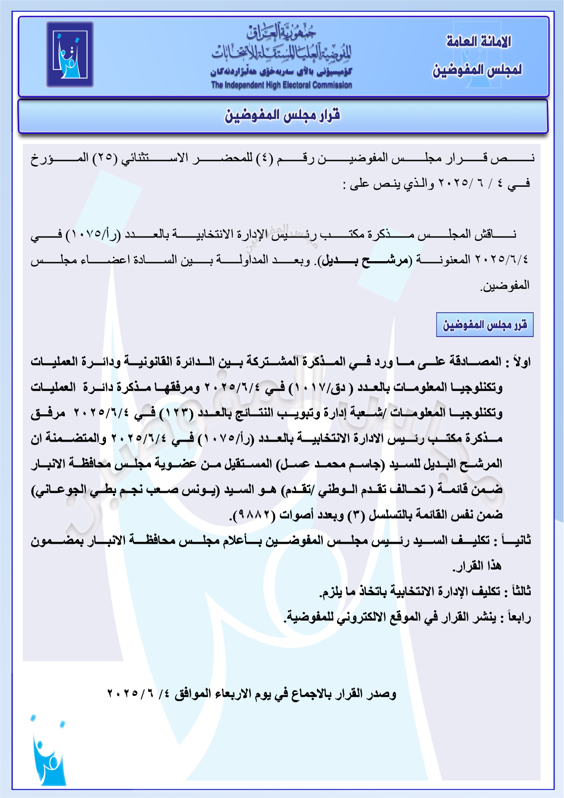 قرار مجلس المفوضيـن رقم (4) للمحضر الاستثنائي (25) المـؤرخ فـــي 2025/6/4