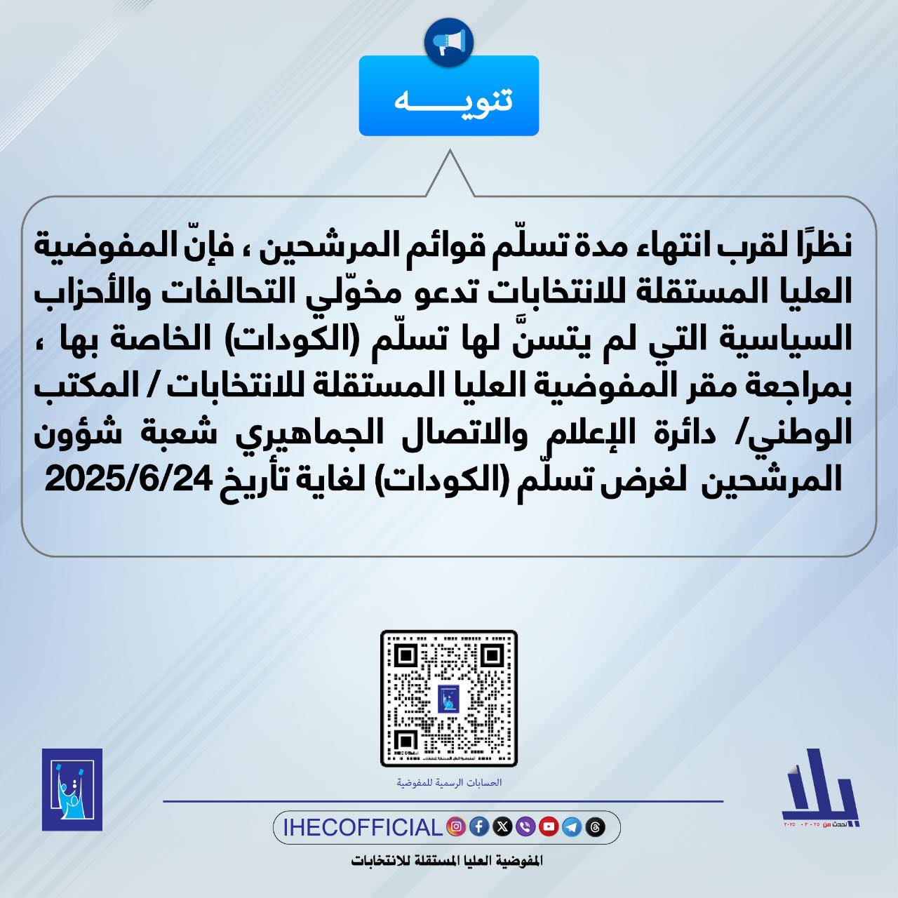 دعت المفوضية العليا المستقلة للانتخابات، مخوّلي التحالفات والأحزاب السياسية التي لم يتسنّ لها تسلّم الكودات الخاصة بها، إلى مراجعة مقر المفوضية لغرض تسلّم (الكودات) قبل انتهاء مدة تسلّم قوائم المرشحين في 24 حزيران الحالي.