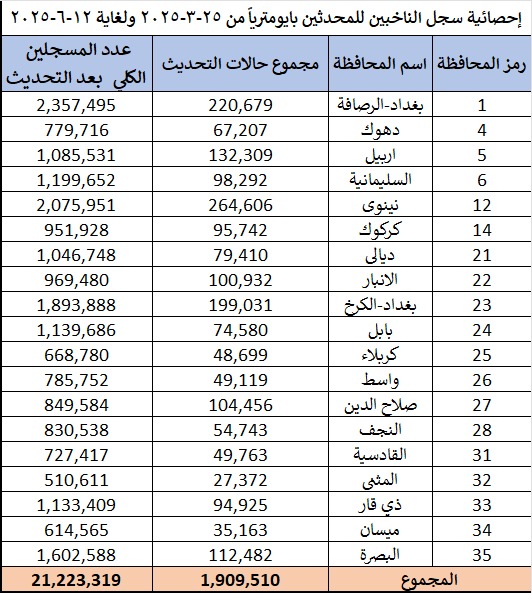 على صعيد ذي صلة، أعلنت المفوضية ارتفاع عدد المحدّثين إلى أكثر من 1.9 مليون ناخب، وفقاً لآخر إحصائية لسجل الناخبين للمحدّثين بايومترياً لغاية نهاية اليوم الخميس.