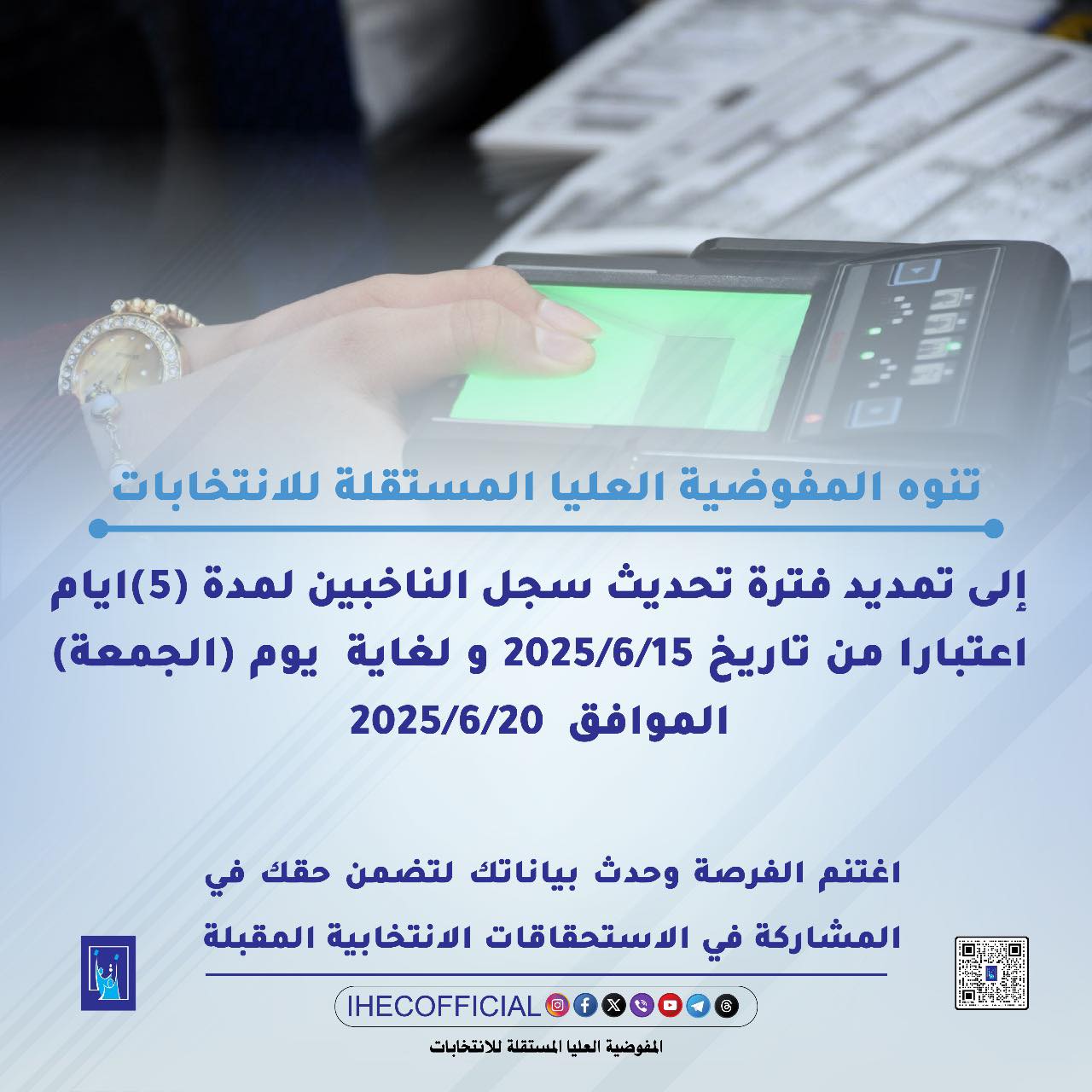 وكانت المفوضية قررت تمديد فترة تحديث سجل الناخبين التي كان من المقرر لها أن تنتهي اليوم، لخمسة أيام أخرى لتنتهي يوم الجمعة المقبل المصادف 20 حزيران الحالي.