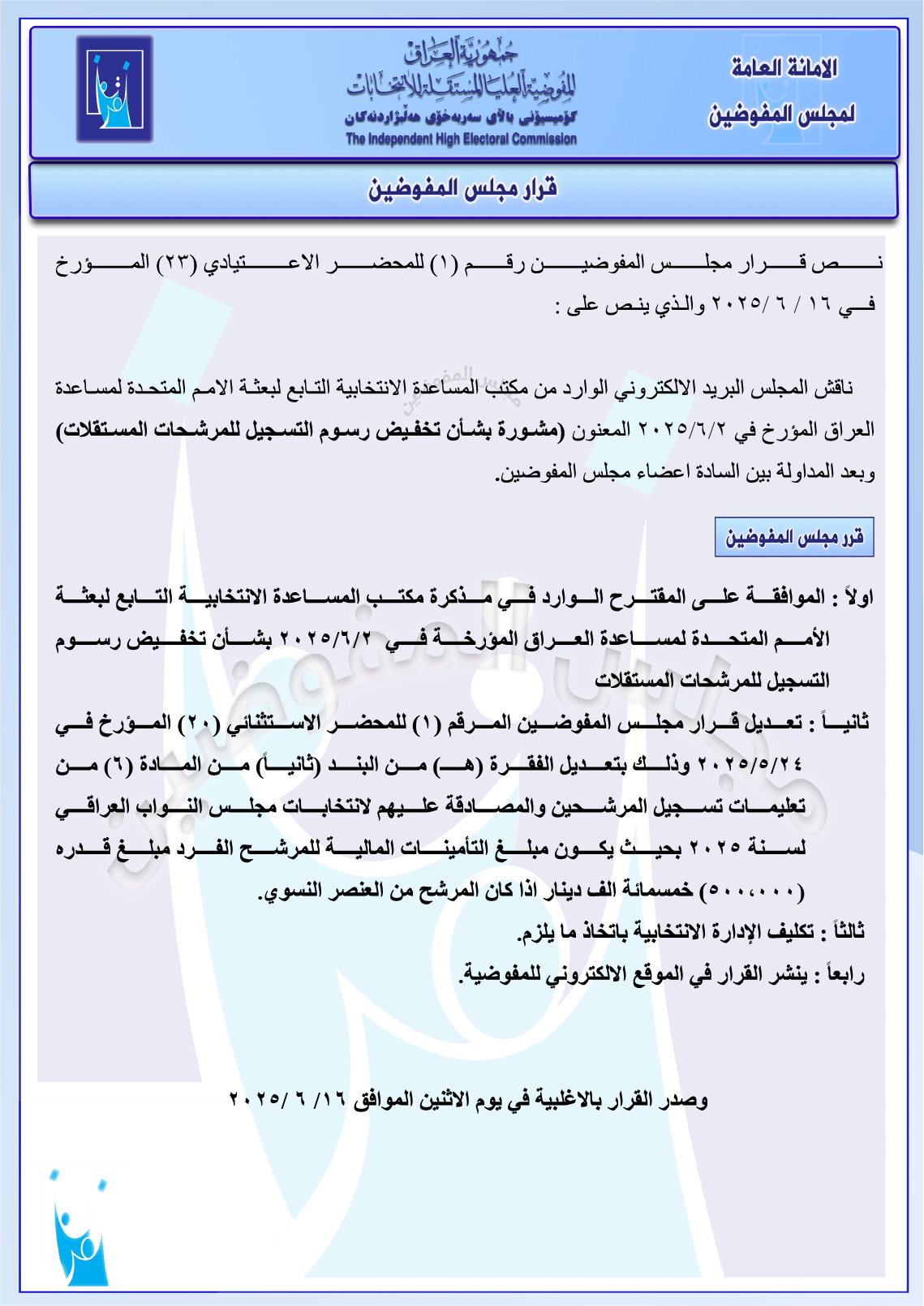 قرار مجلس المفوضيـن رقم (1) للمحضر الاعتيادي (23) المـؤرخ فـــي 2025/6/16