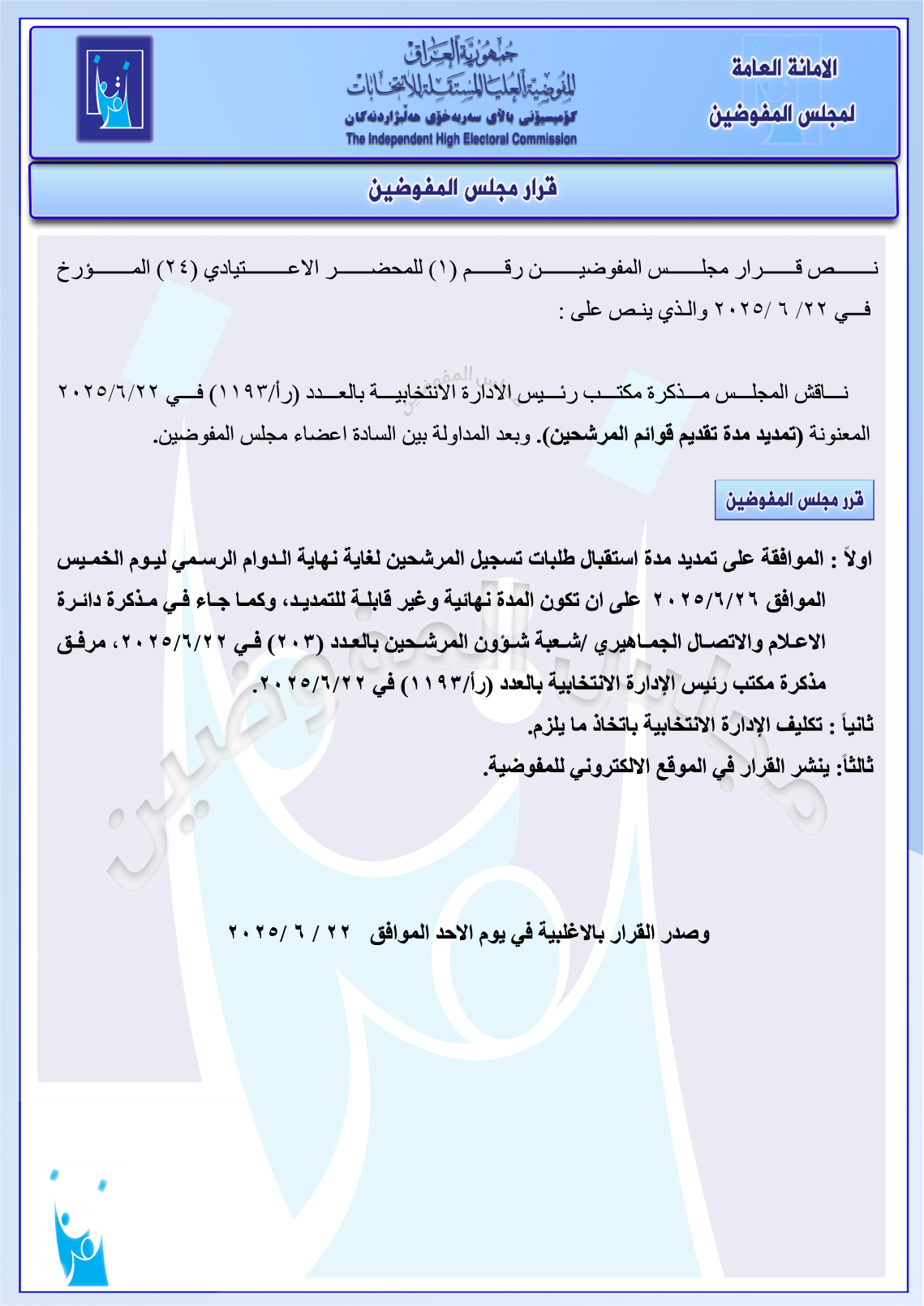 وقالت الناطق الرسمي باسم المفوضية جمانة الغلاي، لشبكة أخبار الانتخابات العراقية، إن “مجلس المفوضين في المفوضية العليا المستقلة للانتخابات قرر تمديد مدة استقبال طلبات تسجيل المرشحين لغاية نهاية الدوام الرسمي ليوم الخميس المقبل، الموافق 26 حزيران الحالي، على أن تكون المدة نهائية وغير قابلة للتمديد”.