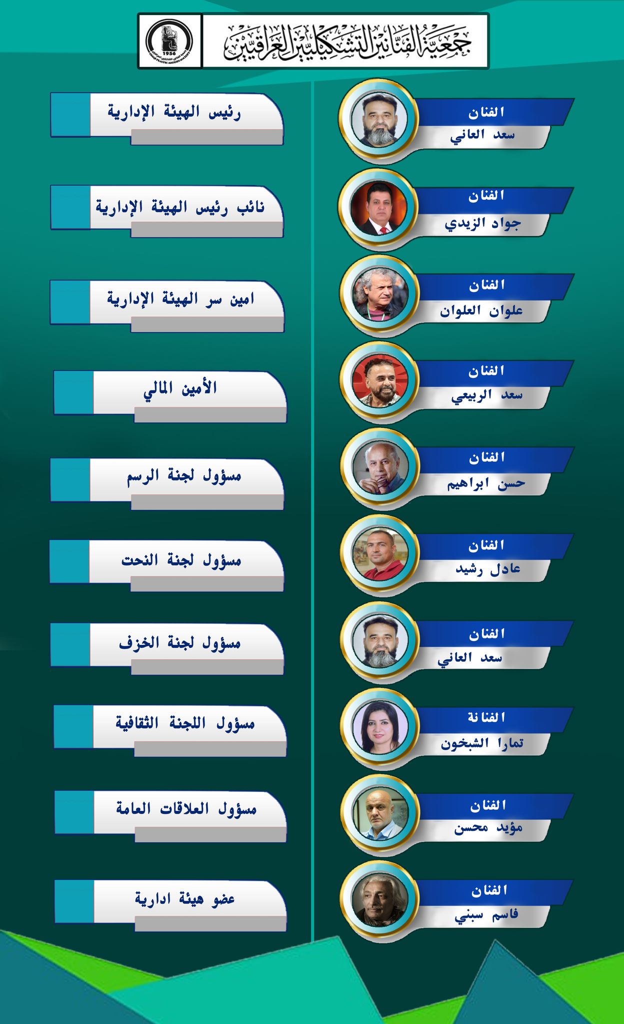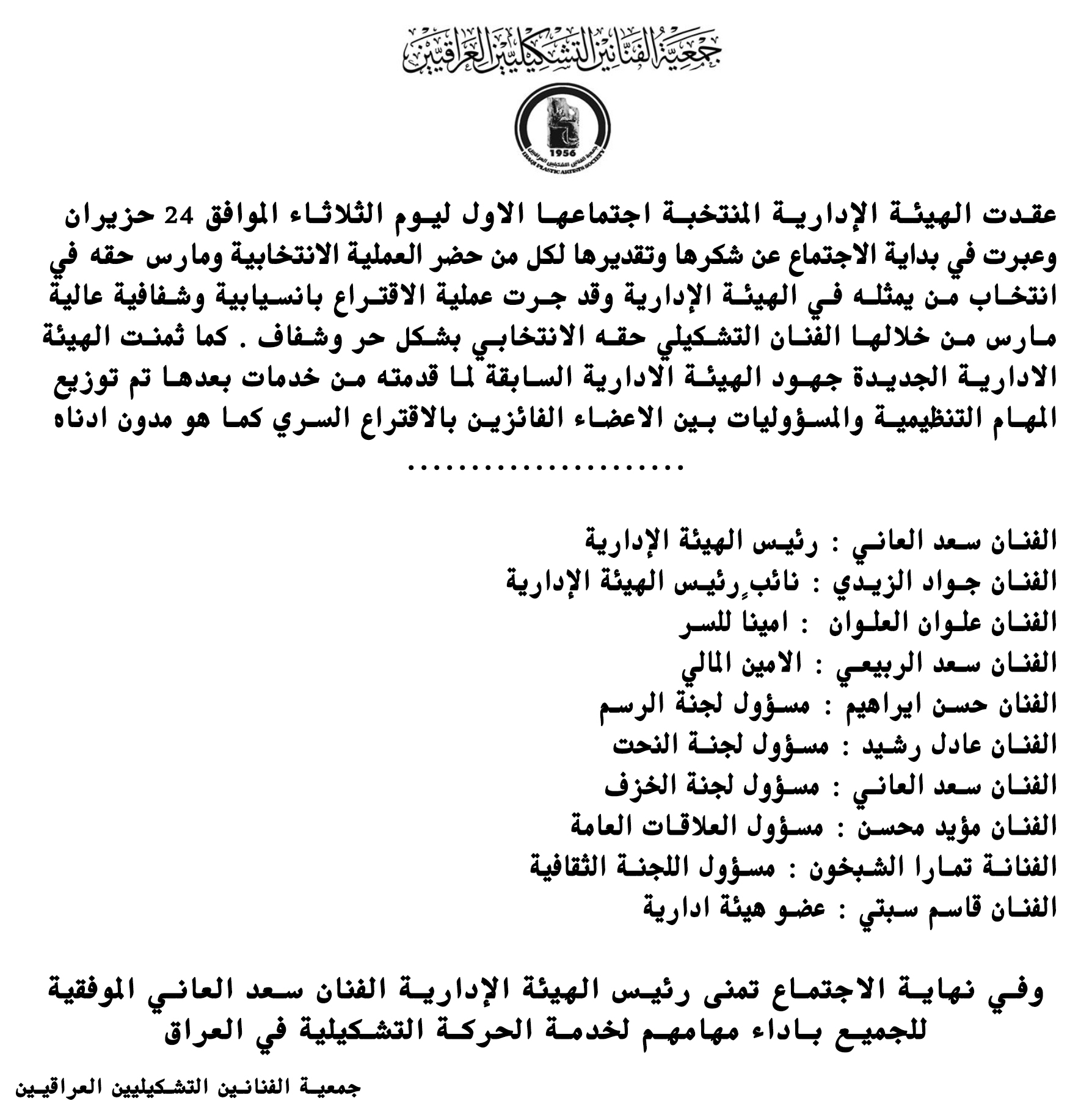 عقدت الهيئة الإدارية المنتخبة اجتماعها الاول ليوم الثلاثاء الموافق 24 حزيران .وعبرت في بداية الاجتماع عن شكرها وتقديرها لكل من حضر العملية الانتخابية ومارس حقه في انتخاب من يمثله في الهيئة الإدارية ، وقد جرت عملية الاقتراع بانسيابية وشفافية عالية مارس من خلالها الفنان التشكيلي حقه الانتخابي بشكل حر وشفاف . كما ثمنت الهيئة الادارية الجديدة جهود الهيئة الادارية السابقة لما قدمته من خدمات.بعدها تم توزيع المهام التنظيمية والمسؤوليات بين الاعضاء الفائزين بالاقتراع السري كما هو مدون ادناه.– الفنان سعد العاني : رئيس الهيئة الإدارية– الفنان جواد الزيدي : نائب رئيس الهيئة الإدارية– الفنان علوان العلوان اميناً للسر– الفنان سعد الربيعي : الامين المالي.– الفنان حسن ايراهيم : مسؤول لجنة الرسم– الفنان عادل رشيد : مسؤول لجنة النحت– الفنان سعد العاني : مسؤول لجنة الخزف– الفنان مؤيد محسن : مسؤول العلاقات العامة– الفنانة تمارا الشيخون : مسؤول اللجنة الثقافية– الفنان قاسم سبتي : عضو هيئة إداريةوفي نهاية الاجتماع تمنى رئيس الهيئة الإدارية الفنان سعد العاني الموفقية للجميع باداء مهامهم لخدمة الحركة التشكيلية في العراق .