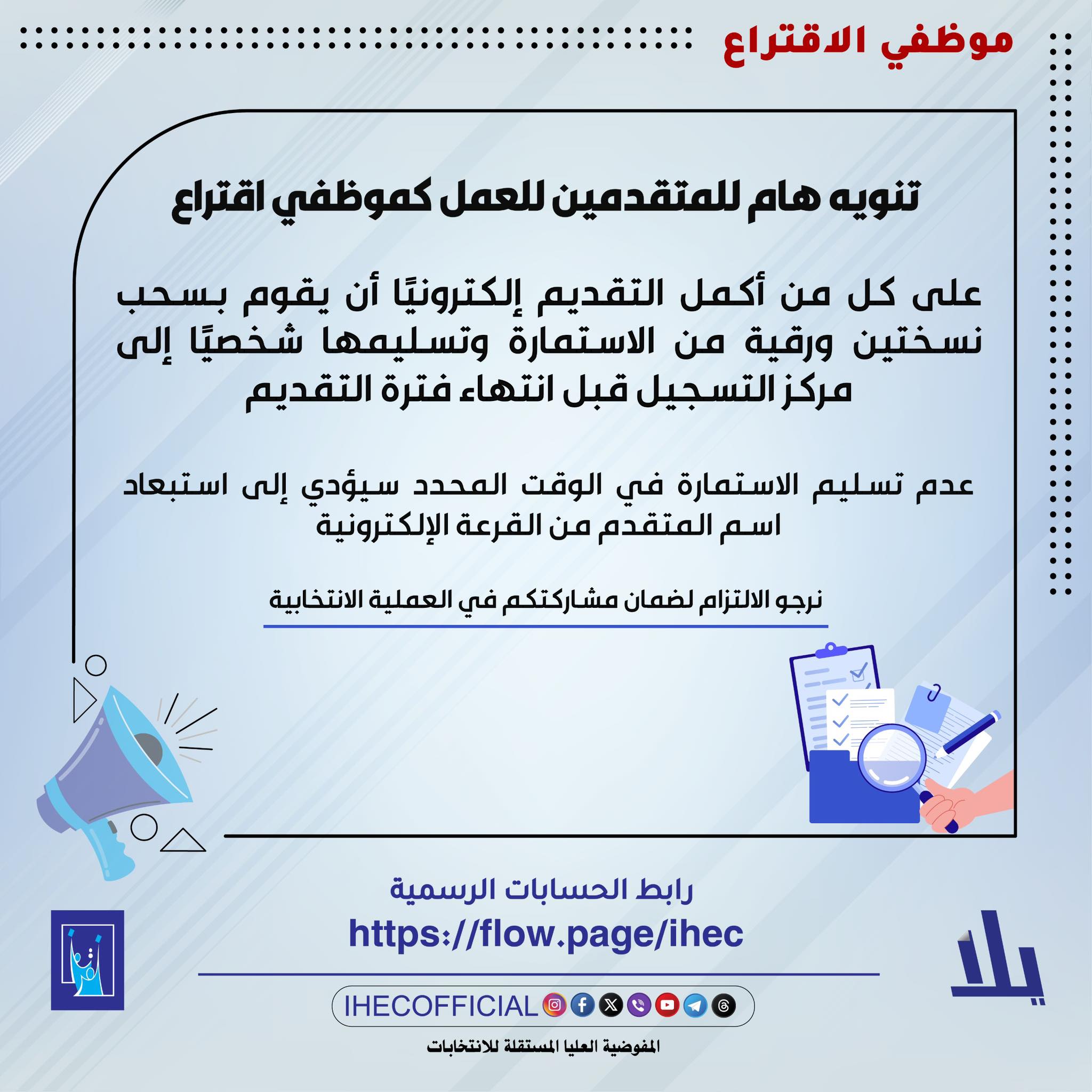 أصدرت المفوضية العليا المستقلة للانتخابات، اليوم الخميس، تنويهاً إلى المتقدمين للعمل كموظفي اقتراع، مبيّنة أن عدم تسليم الاستمارة في الوقت المحدد سيؤدي إلى استبعاد اسم المتقدم من القرعة الإلكترونية.