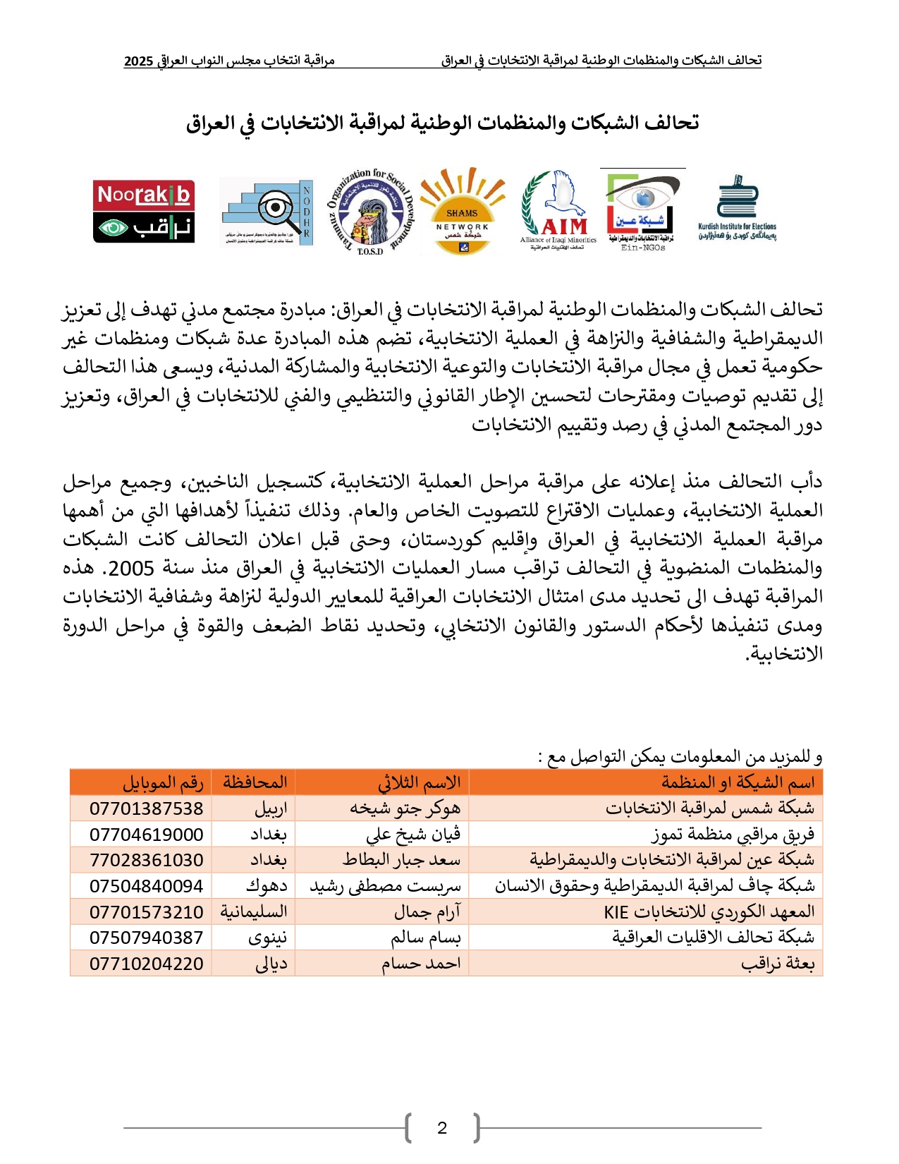 وتحالف الشبكات والمنظمات الوطنية لمراقبة الانتخابات في العراق، مبادرة مجتمع مدني تهدف إلى تعزيز الديمقراطية والشفافية والنزاهة في العملية الانتخابية، تضم هذه المبادرة عدة شبكات ومنظمات غير حكومية تعمل في مجال مراقبة الانتخابات والتوعية الانتخابية والمشاركة المدنية، ويسعى هذا التحالف إلى تقديم توصيات ومقترحات لتحسين الإطار القانوني والتنظيمي والفني للانتخابات في العراق، وتعزيز دور المجتمع المدني في رصد وتقييم الانتخابات.