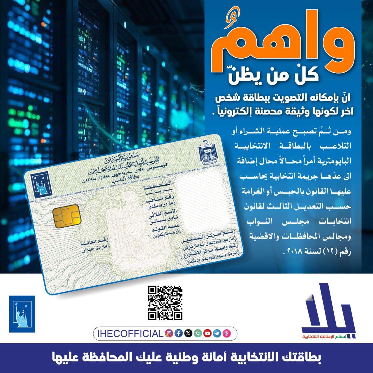 وقالت المفوضية في إعلان لها، “واهم كل من يظن أن بإمكانه التصويت ببطاقة شخص آخر لكونها وثيقة محصنة إلكترونياً ومن ثم تصبح عملية الشراء أو التلاعب بالبطاقة الانتخابية البايومترية أمراً محالاً إضافة الى عدّها جريمة انتخابية يحاسب عليها القانون بالحبس أو الغرامة حسب التعديل الثالث لقانون انتخابات مجلس النواب ومجالس المحافظات والاقضية رقم (١٢) لسنة ٢٠١٨”.