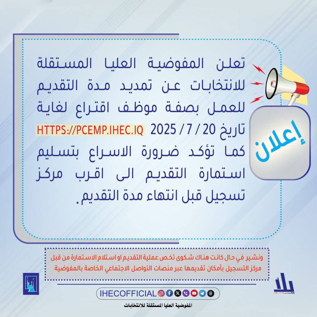 أعلنت المفوضية العليا المستقلة للانتخابات، اليوم الثلاثاء، تمديد مدة التقديم للعمل بصفة موظف اقتراع لغاية يوم الأحد الموافق 2025/7/20.