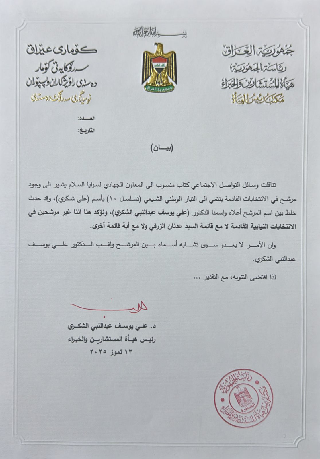 وان الأمر لا يعدو سوى تشابه أسماء بين المرشح ولقب الدكتور علي يوسف عبدالنبي الشكري.