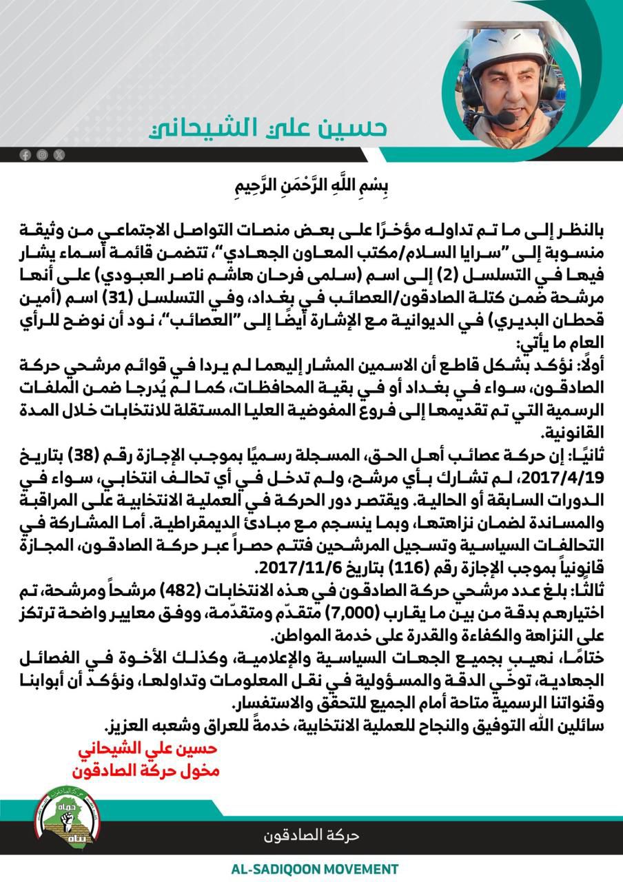 بالنظر إلى ما تم تداوله مؤخرًا على بعض منصات التواصل الاجتماعي من وثيقة منسوبة إلى “سرايا السلام/ مكتب المعاون الجهادي”، تتضمن قائمة أسماء يشار فيها في التسلسل (2) إلى اسم (سلمى فرحان هاشم ناصر العبودي) على أنهـا مرشحة ضمن كتلة الصادقون / العصائب في بغداد، وفي التسلسل (31) اسم (أمين قحطان البديري) في الديوانية مع الإشارة أيضًا إلى “العصائب”، نود أن نوضح للرأي العام ما يأتي: