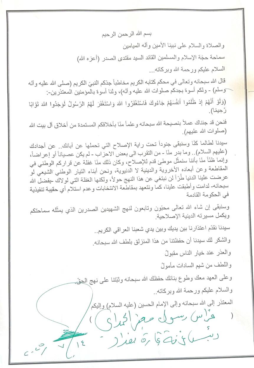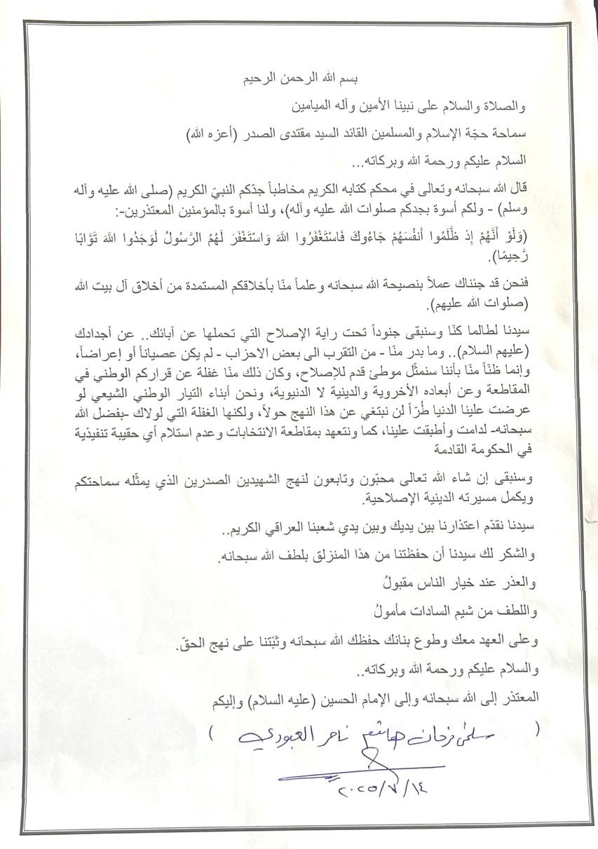 ونشرت عدد من وسائل الإعلام وثيقتين، وقع عليها كل من رئيس غرفة تجارة بغداد فراس الحمداني، والمرشحة سلمى العبودي، يعلنان فيها تراجعهما عن الترشيح للانتخابات النيابية المقبلة، معلنين اعتذارهما للصدر.