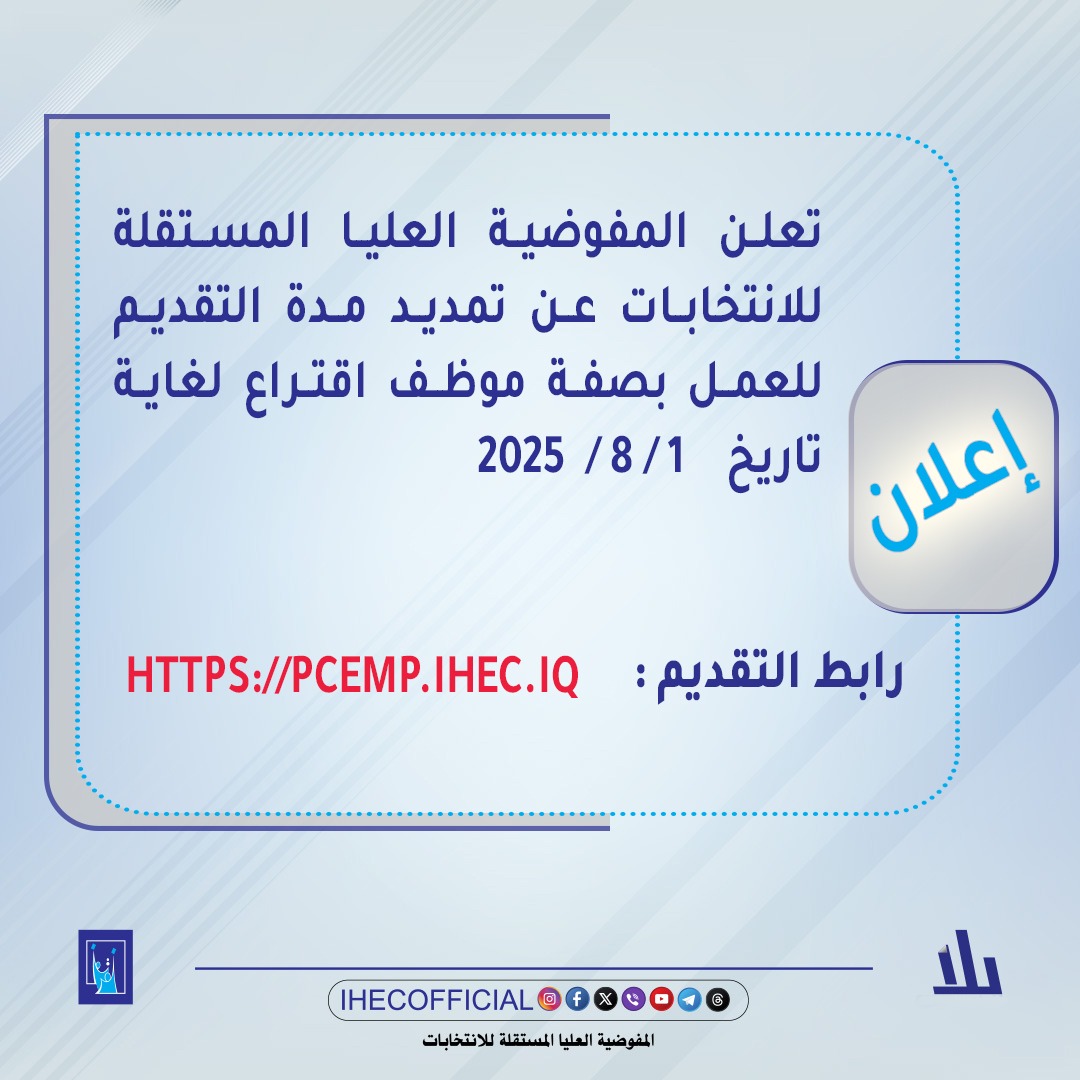 أعلنت المفوضية العليا المستقلة للانتخابات، اليوم الأحد، حصول موافقة مجلس المفوضين على تمديد التقديم الخاص بموظفي الاقتراع لغاية يوم الجمعة المقبل الموافق للأول من شهر آب المقبل.