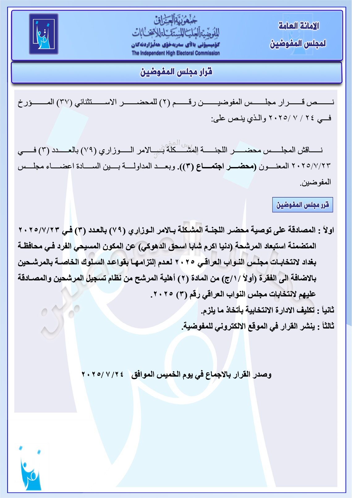 مجلس المفوضين يقرر استبعاد مرشحة مسيحية في بغداد لعدم التزامها بقواعد السلوك (وثيقة)