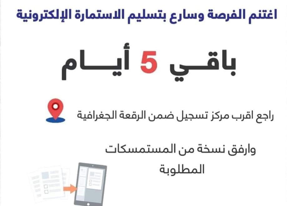 وقال المكتب في إعلان موجّه للمتقدمين للعمل كموظفي اقتراع، إن خمسة ايام متبقية للموعد، داعية إلى الإسراع بتسليم الاستمارة الإلكترونية.
