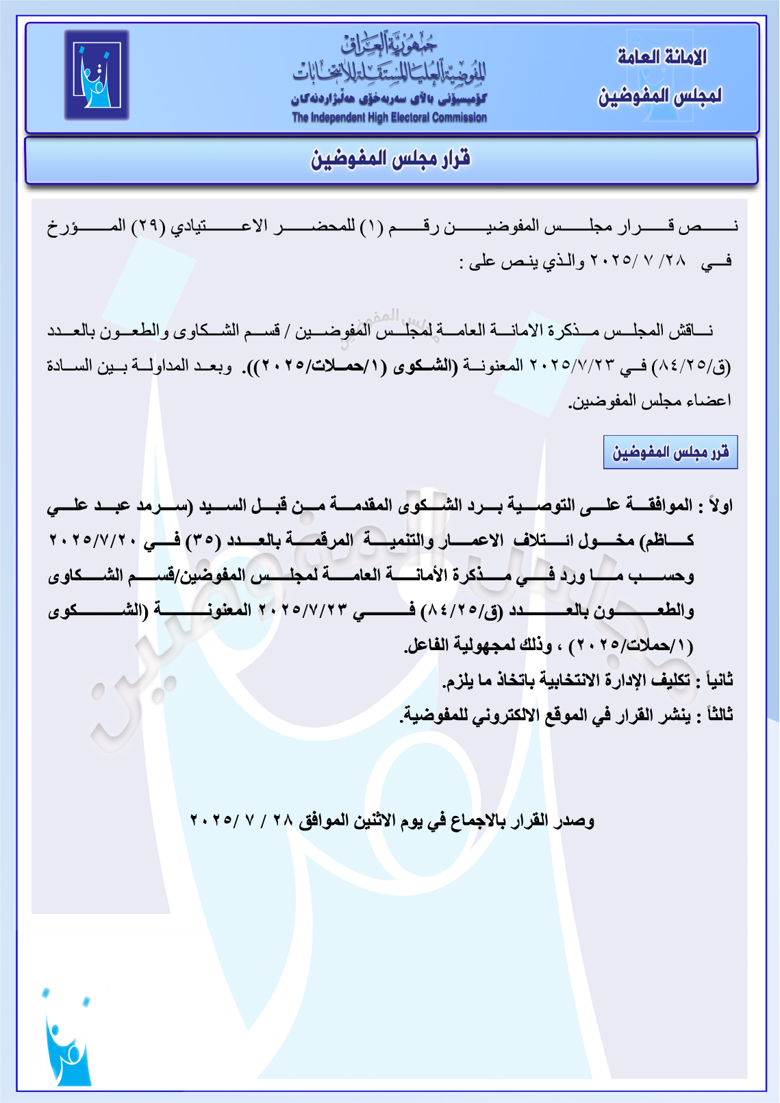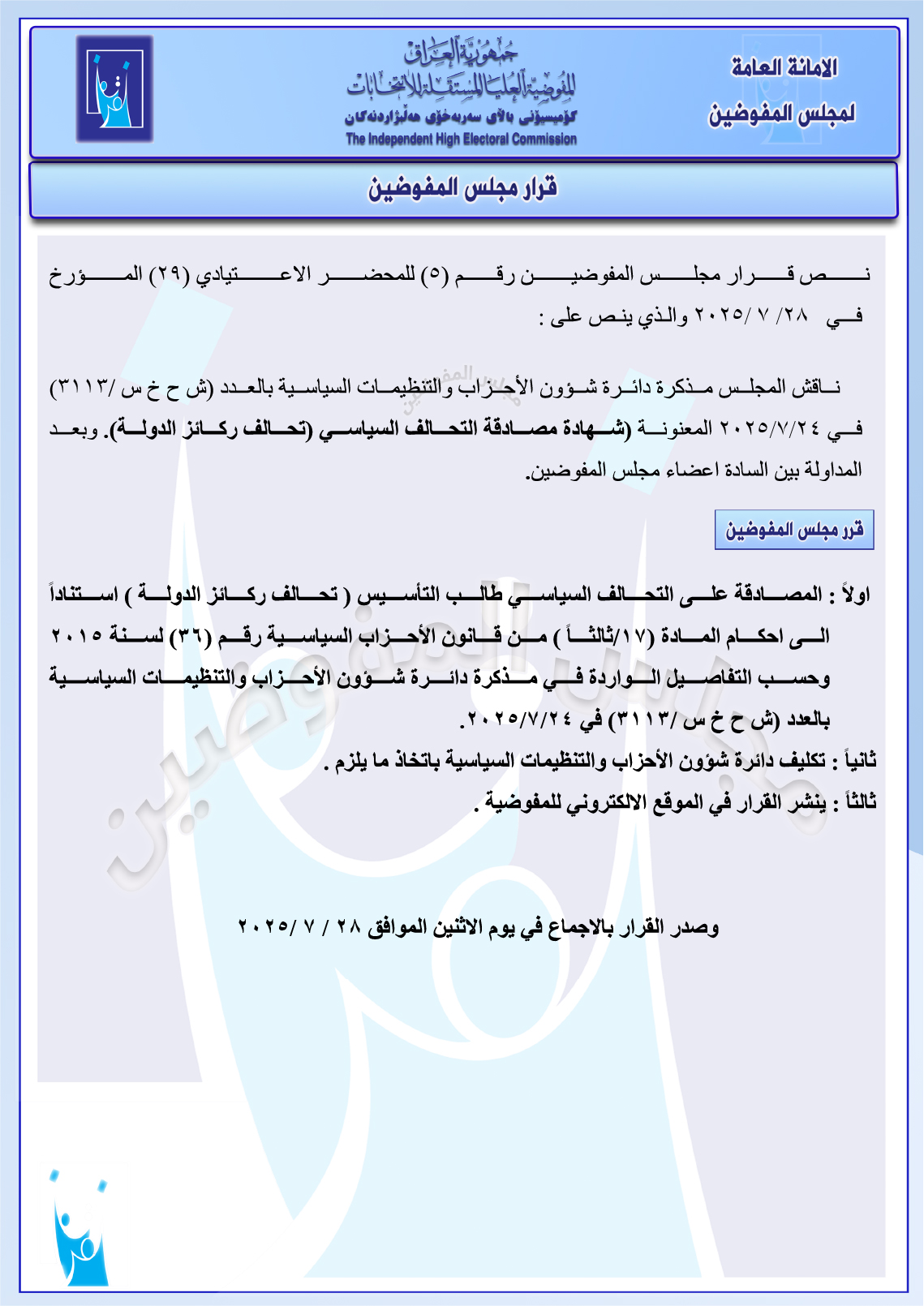 صادق مجلس المفوضين في المفوضية العليا المستقلة للانتخابات، على طلب تأسيس تحالف سياسي جديد، فضلاً عن رد شكوى مقدمة من مخوّل ائتلاف آخر، وفقاً لوثيقتين صادرتن عن المجلس.