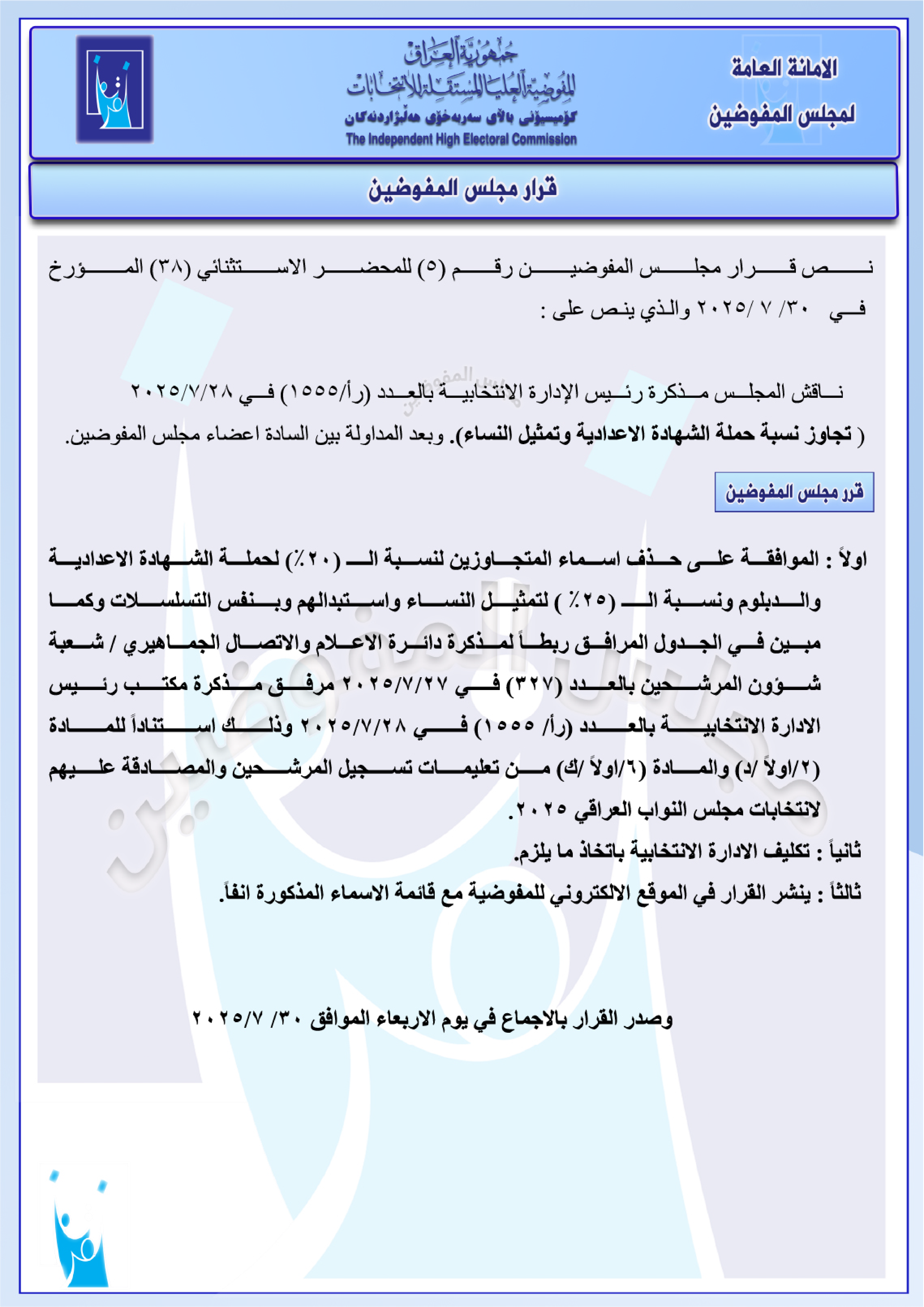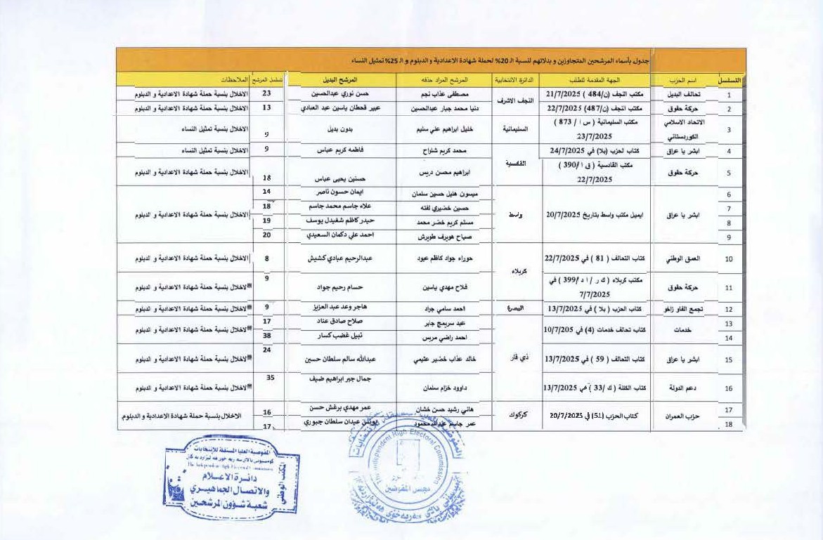 ووفقاً لليان، فأن “القرار تضمن الموافقة على حذف أسماء المرشحين الذين تجاوزوا نسبة الـ20% لحملة الشهادة الإعدادية والدبلوم، والـ25% الخاصة بتمثيل النساء، واستبدالهم بنفس التسلسلات”.