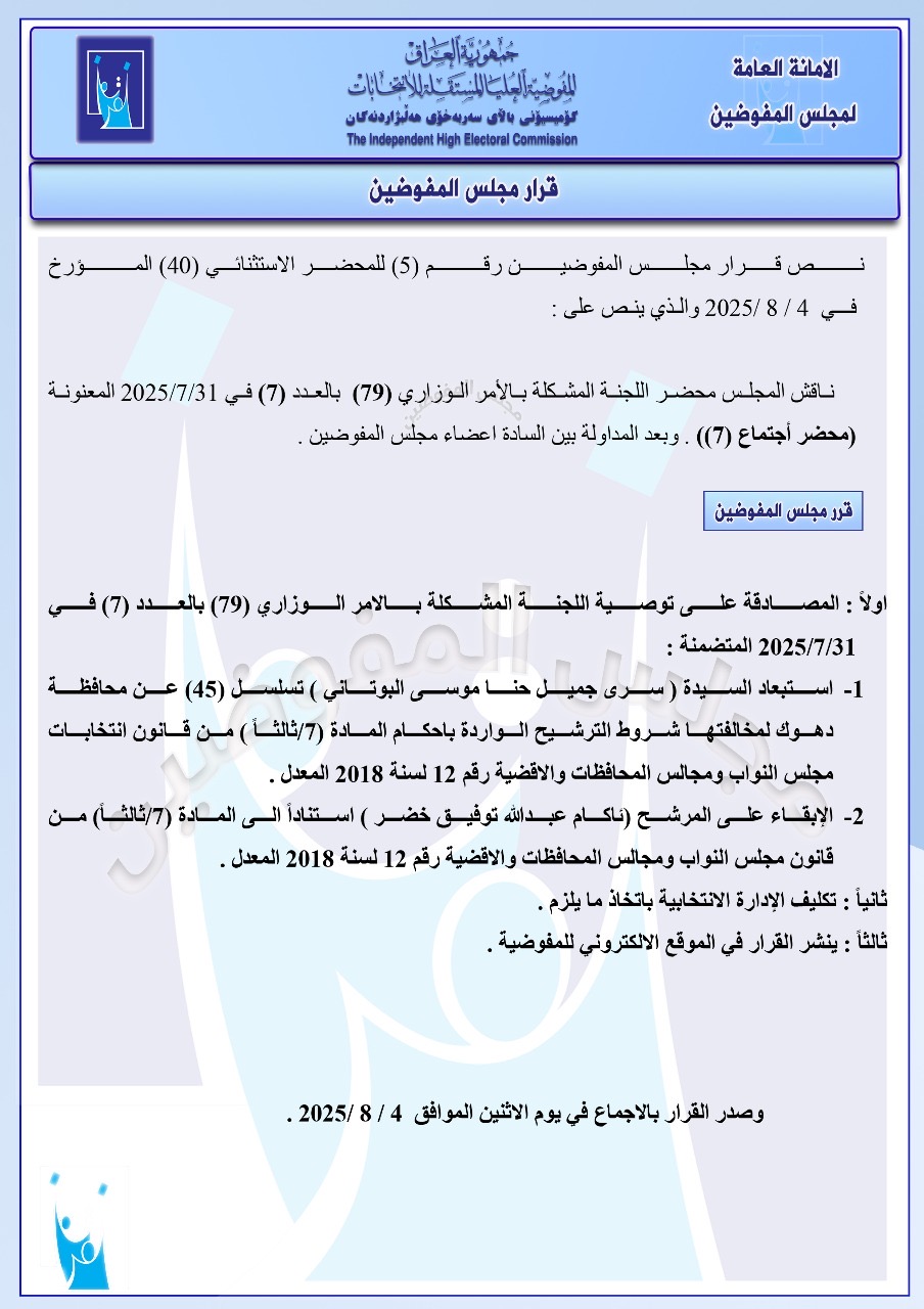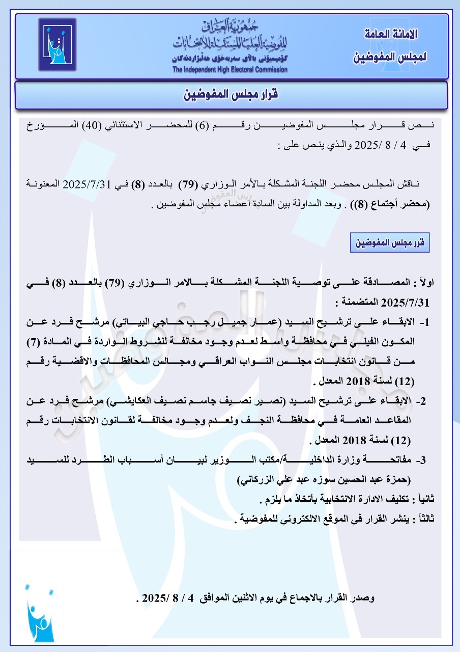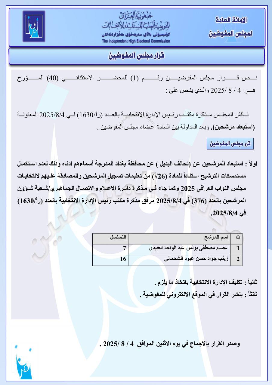 تنشر شبكة أخبار الانتخابات العراقية، جميع القرارات التي أصدرها مجلس المفوضين ونشرتها المفوضية العليا المستقلة للانتخابات في موقعها الإلكتروني اليوم الاثنين، للإطلاع على مضامين هذه القرارات التي تتضمن استبعاد 5 مرشحين للانتخابات النيابية المقبلة.