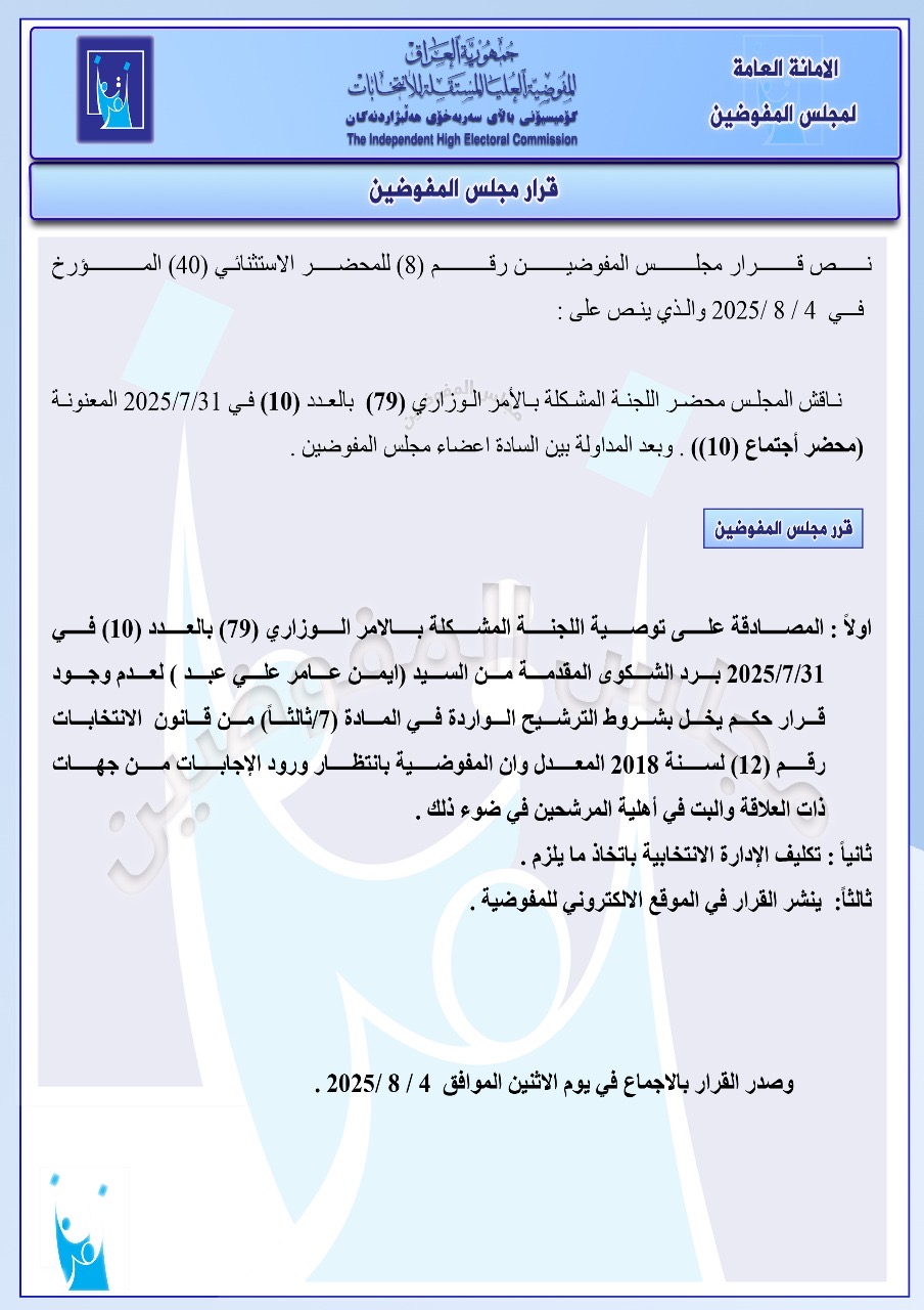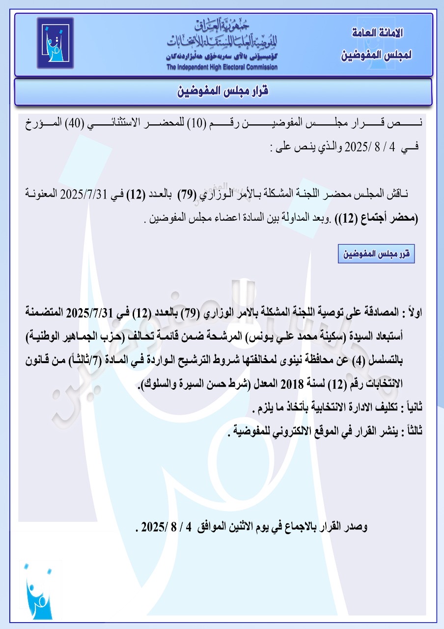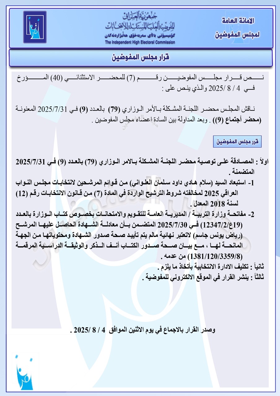 تنشر شبكة أخبار الانتخابات العراقية، جميع القرارات التي أصدرها مجلس المفوضين ونشرتها المفوضية العليا المستقلة للانتخابات في موقعها الإلكتروني اليوم الاثنين، للإطلاع على مضامين هذه القرارات التي تتضمن استبعاد 5 مرشحين للانتخابات النيابية المقبلة.