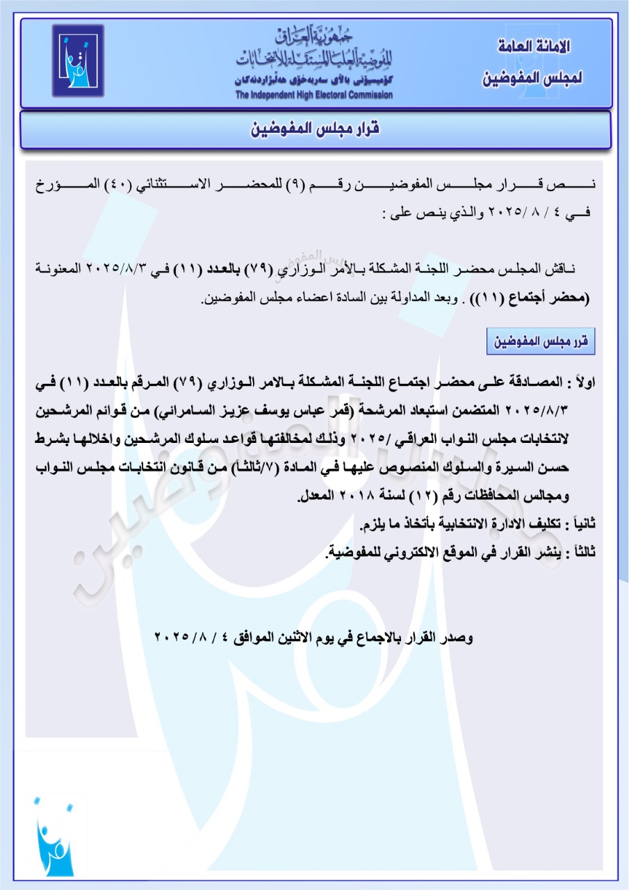 نشرت المفوضية العليا المستقلة للانتخابات، اليوم الثلاثاء، قرار مجلس المفوضين الخاص باستبعاد المرشحة قمر السامرائي من قوائم المرشحين لانتخابات مجلس النواب العراقي 2025، موضحة أن أسباب الاستبعاد تتعلّق بمخالفتها قواعد سلوك المرشحين والإخلال بشرط حسن السيرة والسلوك، وفقاً للوثيقة الصادرة عن المجلس.