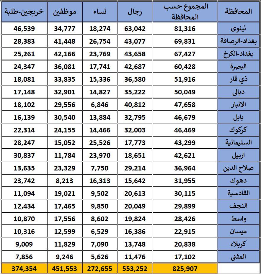 وتصدرت بغداد، بجانبي الكرخ الرصافة، عدد المتقدمين، حيث تجاوز 137 ألف متقدم، تلتها نينوى، بـ81 ألفاً و316، ثم البصرة بـ60 ألفاً و428 متقدم.