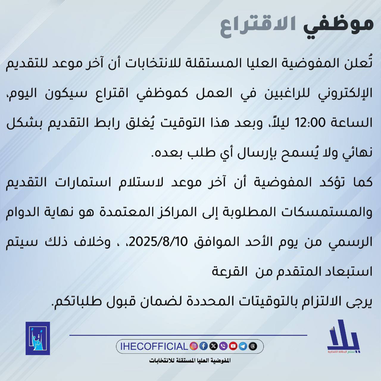 أعلنت المفوضية العليا المستقلة للانتخابات، إغلاق باب التقديم الإلكتروني، للراغبين بالعمل كموظفي اقتراع، وفيما حددت الأحد 10 آب موعداً نهائياً لتسليم المتقدمين استماراتهم إلى مراكز التسجيل المحلية، بينت أنه سيتم استبعاد المتخلفين عن تقديم المستمسكات المطلوبة.