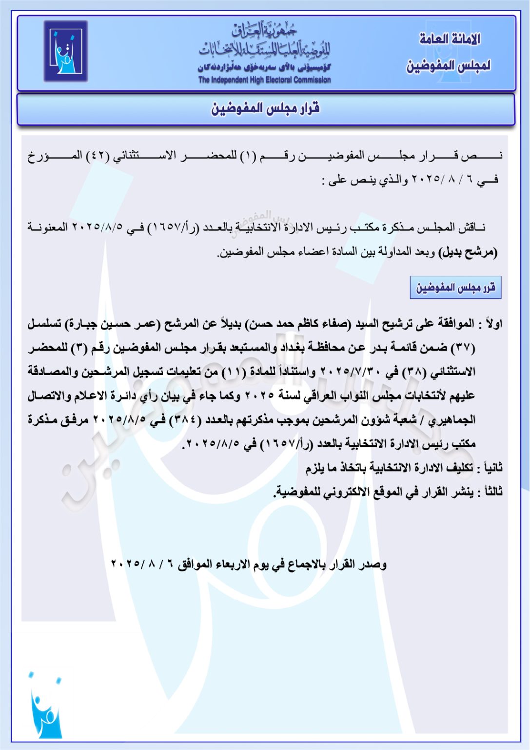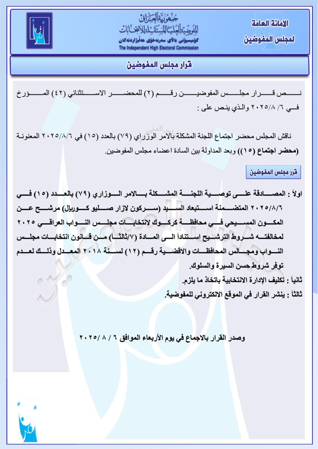 قرر مجلس المفوضين في المفوضية العليا المستقلة للانتخابات، استبعاد الوزير السابق سركون لازار صليو، من الانتخابات النيابية المقبلة لمخالفته شروط الترشيح، في حين وافق المجلس على ترشيح بديل لمرشح مستبعد عن قائمة بدر في محافظة بغداد والإبقاء على استبعاد مرشح آخر في محافظة أربيل، وفقاً لوثائق صادرة عن المجلس.