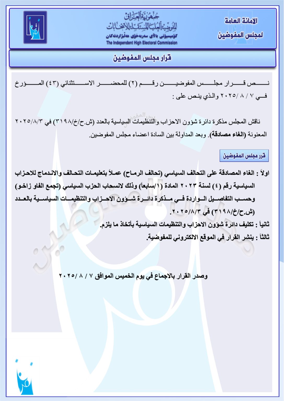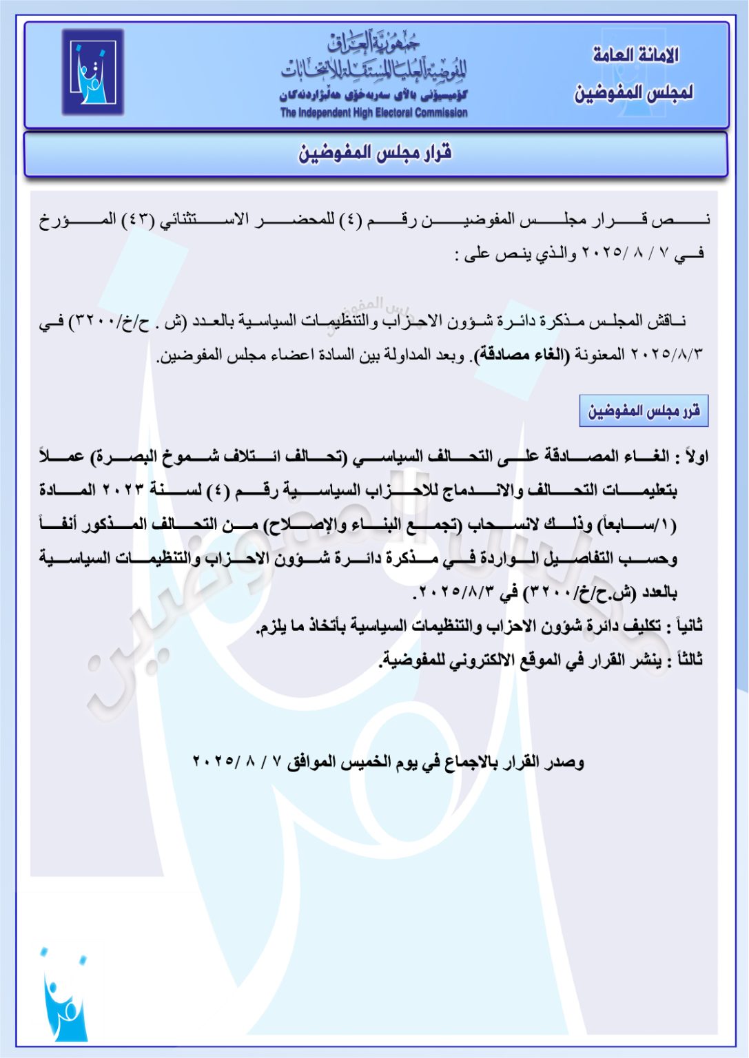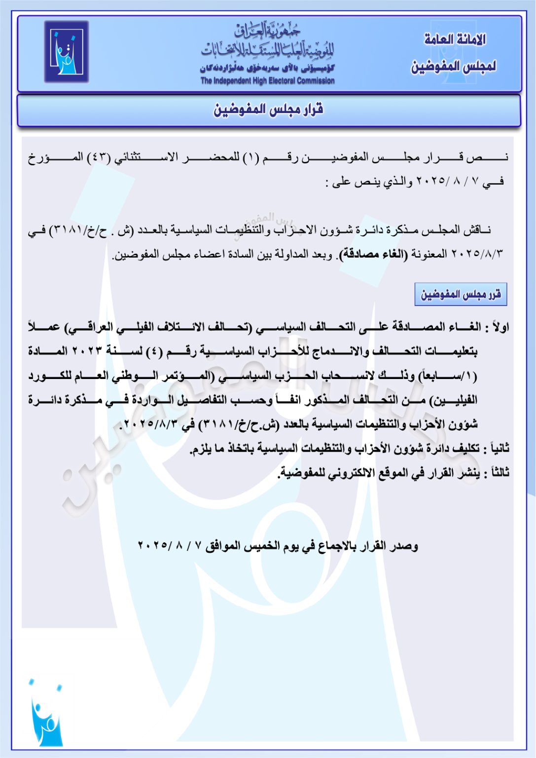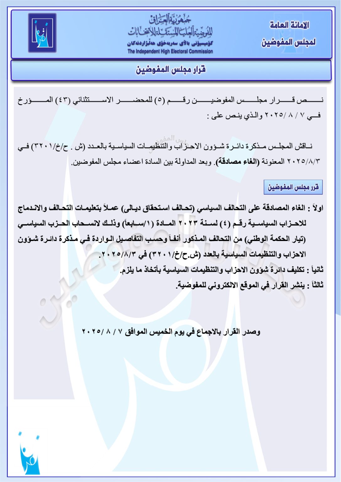 مجلس المفوضين يلغي مصادقته على 6 تحالفات سياسية.. ويقرر استبعاد مرشح عن واسط (وثائق)