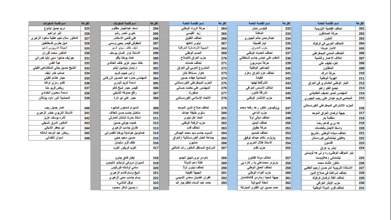 نشرت المفوضية العليا المستقلة للانتخابات، النتائج النهائية لقرعة الأرقام الانتخابية للتحالفات والأحزاب والمرشحين الأفراد وفقاً لوثيقة صادرة عن المفوضية.