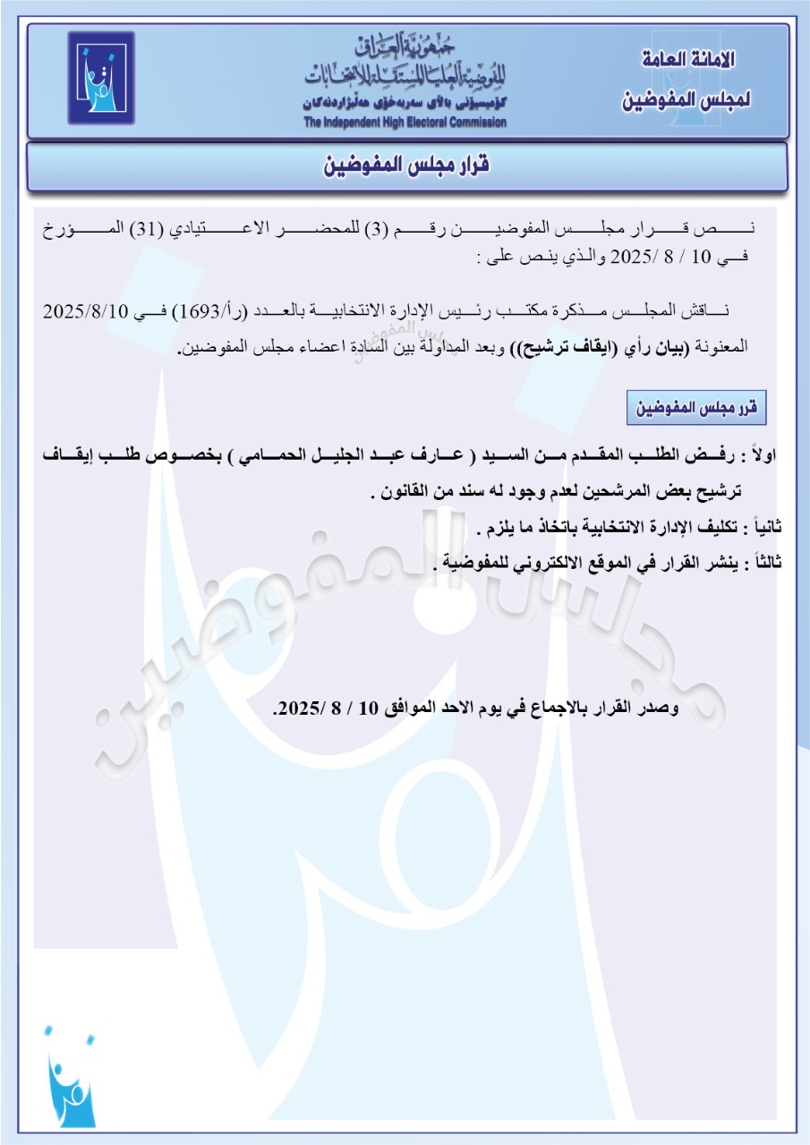أصدرت المفوضية العليا المستقلة للانتخابات، 3 قرارات تتعلق بملفات مرشحين للانتخابات النيابية المقبلة.