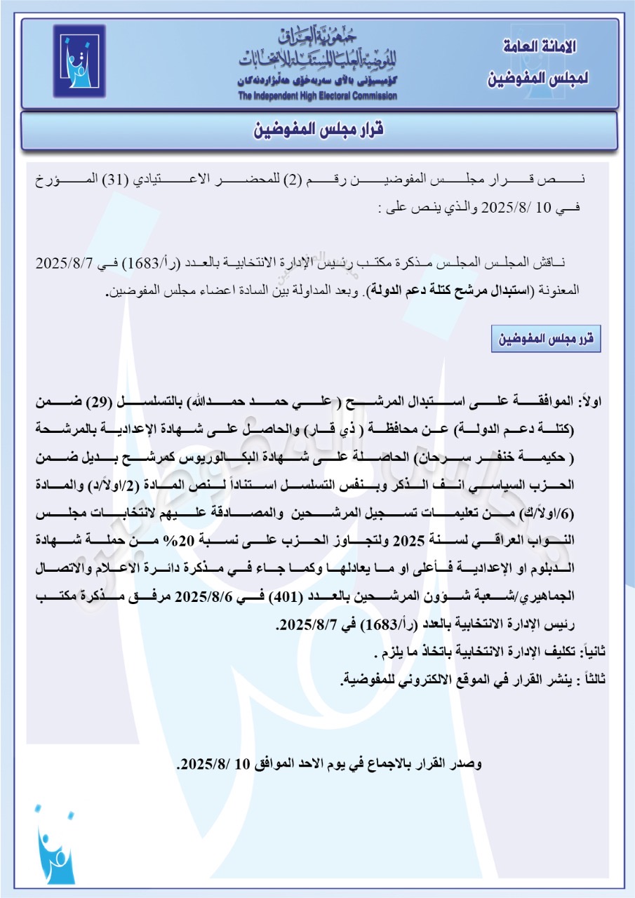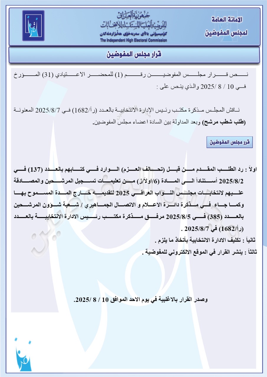 وشملت القرارات رفض طلب تحالف العزم شطب أحد المرشحين لوروده خارج المدة القانونية، والموافقة على استبدال مرشح في كتلة دعم الدولة بمحافظة ذي قار بمرشحة تحمل مؤهلاً أعلى التزاماً بالنسبة المحددة للمؤهلات الدراسية، إضافة إلى رفض طلب إيقاف ترشيح عدد من المرشحين لعدم استناده إلى أساس قانوني.