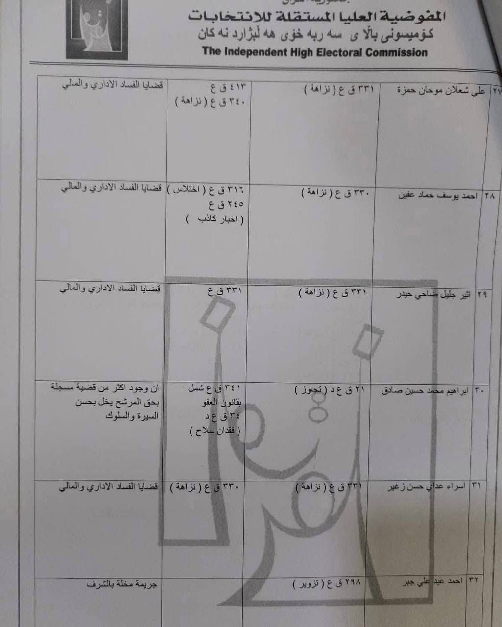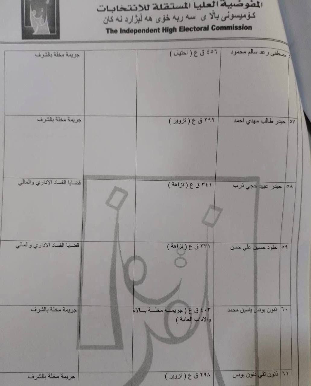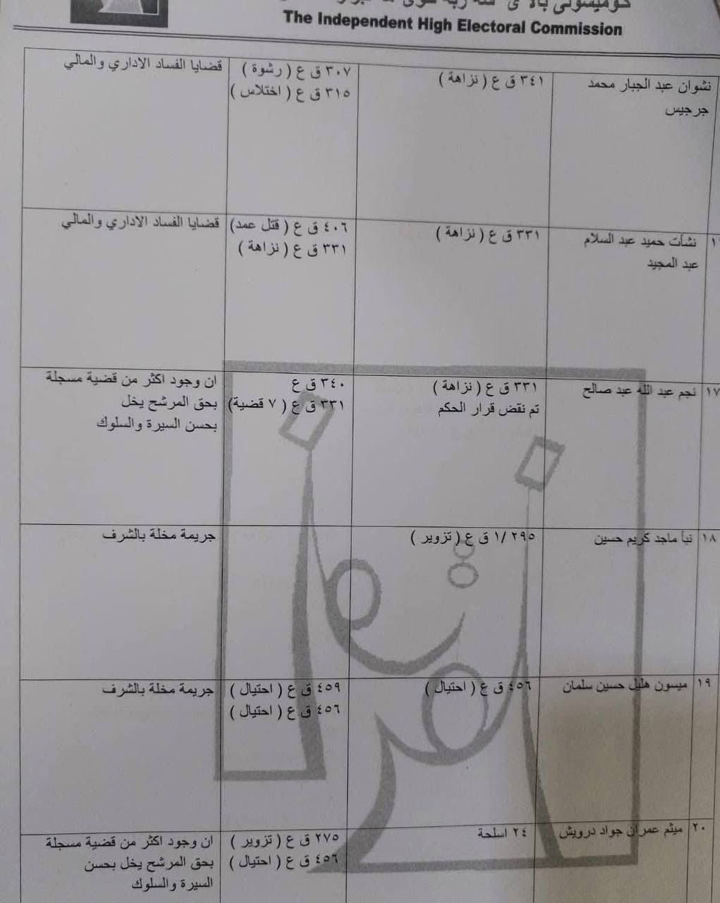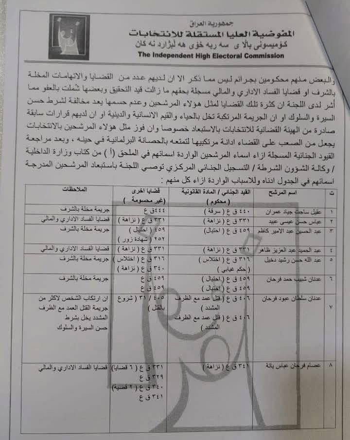 ووفقاً لوثائق صادرة عن المفوضية، تحققت شبكة أخبار الانتخابات العراقية من صحتها، فأن التوصية بالاستبعاد، جاءت استناداً لنتائج تدقيق وكالة شؤون الشرطة في وزارة الداخلية، ارتباط أسماء أولئك المرشحين بقضايا مختلفة تتعلق بأحكام جنائية وأخرى ترتبط بشبهات فساد وتزوير.